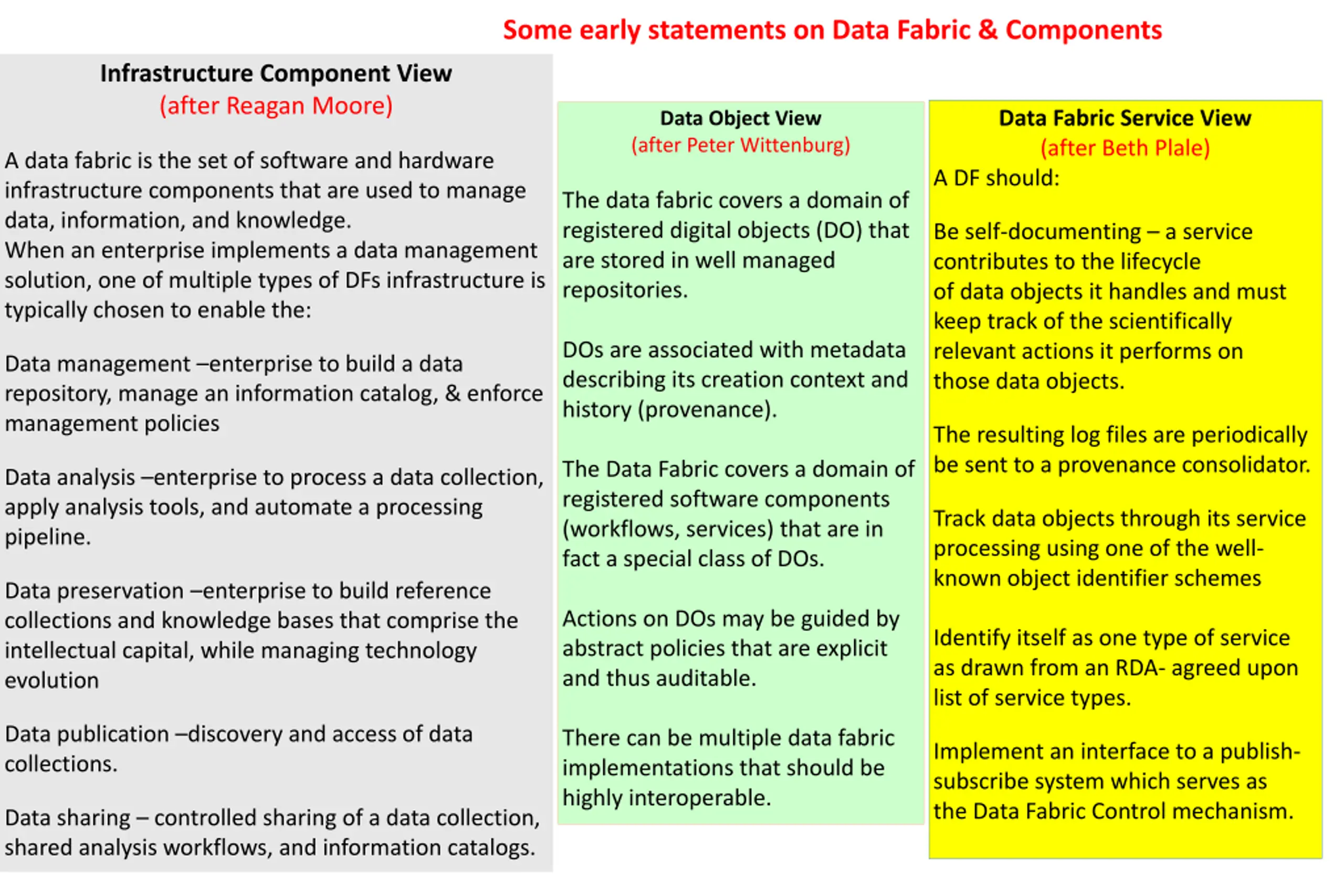 Some early statements on Data Fabric & Components Infrastructure Component View (after Reagan Moore) Data Fabric Service View (after Beth Plale) A DF should: Data Object View (after Peter Wittenburg) A data fabric is the set of software and hardware infrastructure components that are used to manage data, information, and knowledge. When an enterprise implements a data management solution, one of multiple types of DFs infrastructure is typically chosen to enable the: The data fabric covers a domain of registered digital objects (DO) that are stored in well managed repositories. Be self-documenting a service contributes to the lifecycle of data objects it handles and must keep track of the scientifically relevant actions it performs on those data objects. DOs are associated with metadata describing its creation context and history (provenance). Data management enterprise to build a data repository, manage an information catalog, & enforce management policies The resulting log files are periodically be sent to a provenance consolidator. The Data Fabric covers a domain of registered software components (workflows, services) that are in fact a special class of DOs. Data analysis enterprise to process a data collection, apply analysis tools, and automate a processing pipeline. Track data objects through its service processing using one of the well- known object identifier schemes Data preservation enterprise to build reference collections and knowledge bases that comprise the intellectual capital, while managing technology evolution Actions on DOs may be guided by abstract policies that are explicit and thus auditable. Identify itself as one type of service as drawn from an RDA- agreed upon list of service types. Data publication discovery and access of data collections. There can be multiple data fabric implementations that should be highly interoperable. Implement an interface to a publish- subscribe system which serves as the Data Fabric Control mechanism. Data sharing controlled sharing of a data collection, shared analysis workflows, and information catalogs.