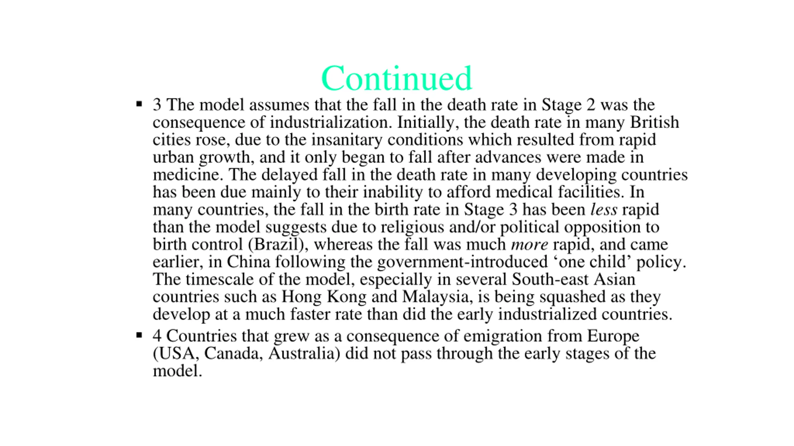 Continued 3 The model assumes that the fall in the death rate in Stage 2 was the consequence of industrialization. Initially, the death rate in many British cities rose, due to the insanitary conditions which resulted from rapid urban growth, and it only began to fall after advances were made in medicine. The delayed fall in the death rate in many developing countries has been due mainly to their inability to afford medical facilities. In many countries, the fall in the birth rate in Stage 3 has been less rapid than the model suggests due to religious and/or political opposition to birth control (Brazil), whereas the fall was much more rapid, and came earlier, in China following the government-introduced one child policy. The timescale of the model, especially in several South-east Asian countries such as Hong Kong and Malaysia, is being squashed as they develop at a much faster rate than did the early industrialized countries. 4 Countries that grew as a consequence of emigration from Europe (USA, Canada, Australia) did not pass through the early stages of the model.