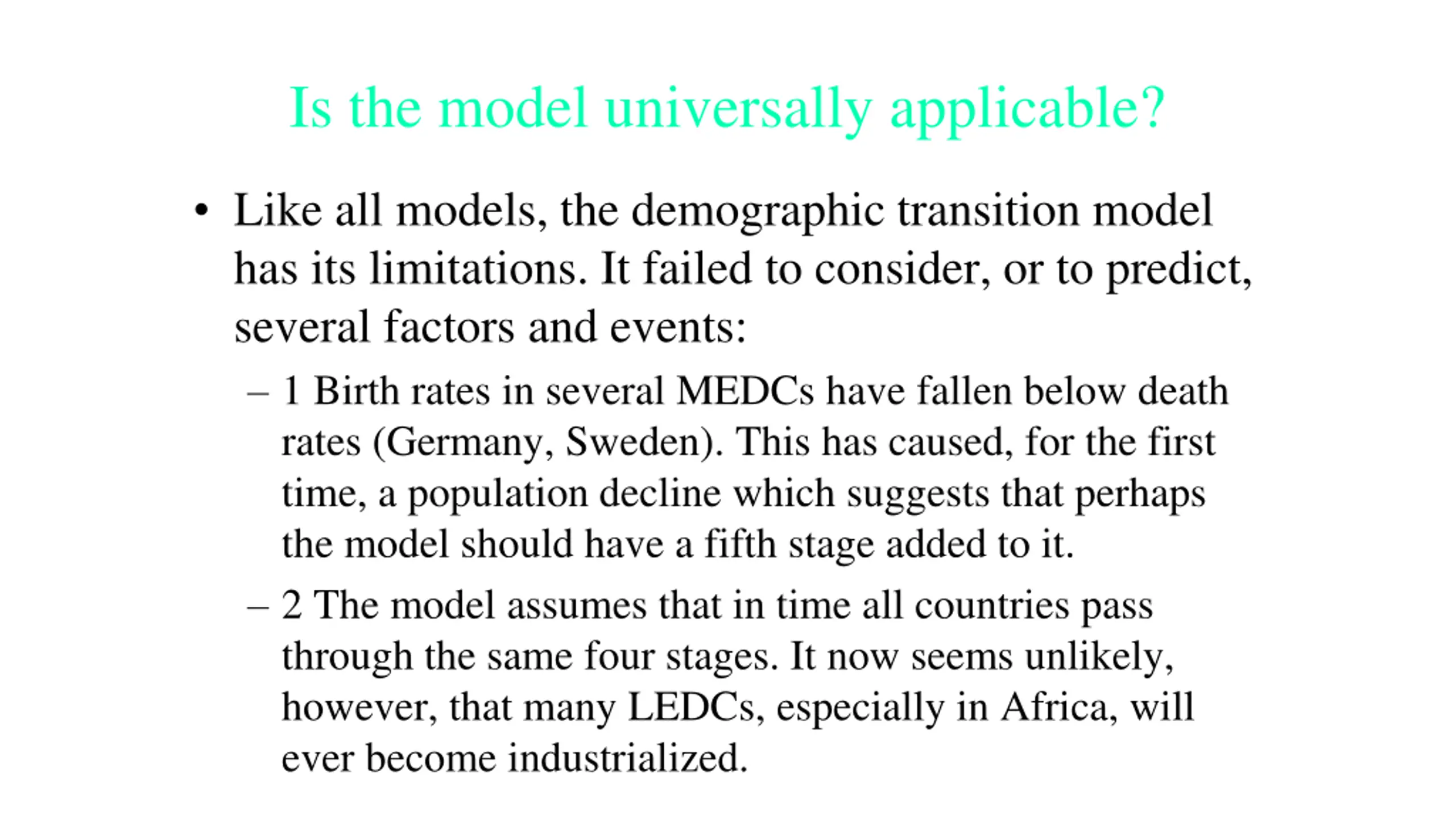 Is the model universally applicable? Like all models, the demographic transition model has its limitations. It failed to consider, or to predict, several factors and events: 1 Birth rates in several MEDCs have fallen below death rates (Germany, Sweden). This has caused, for the first time, a population decline which suggests that perhaps the model should have a fifth stage added to it. 2 The model assumes that in time all countries pass through the same four stages. It now seems unlikely, however, that many LEDCs, especially in Africa, will ever become industrialized.