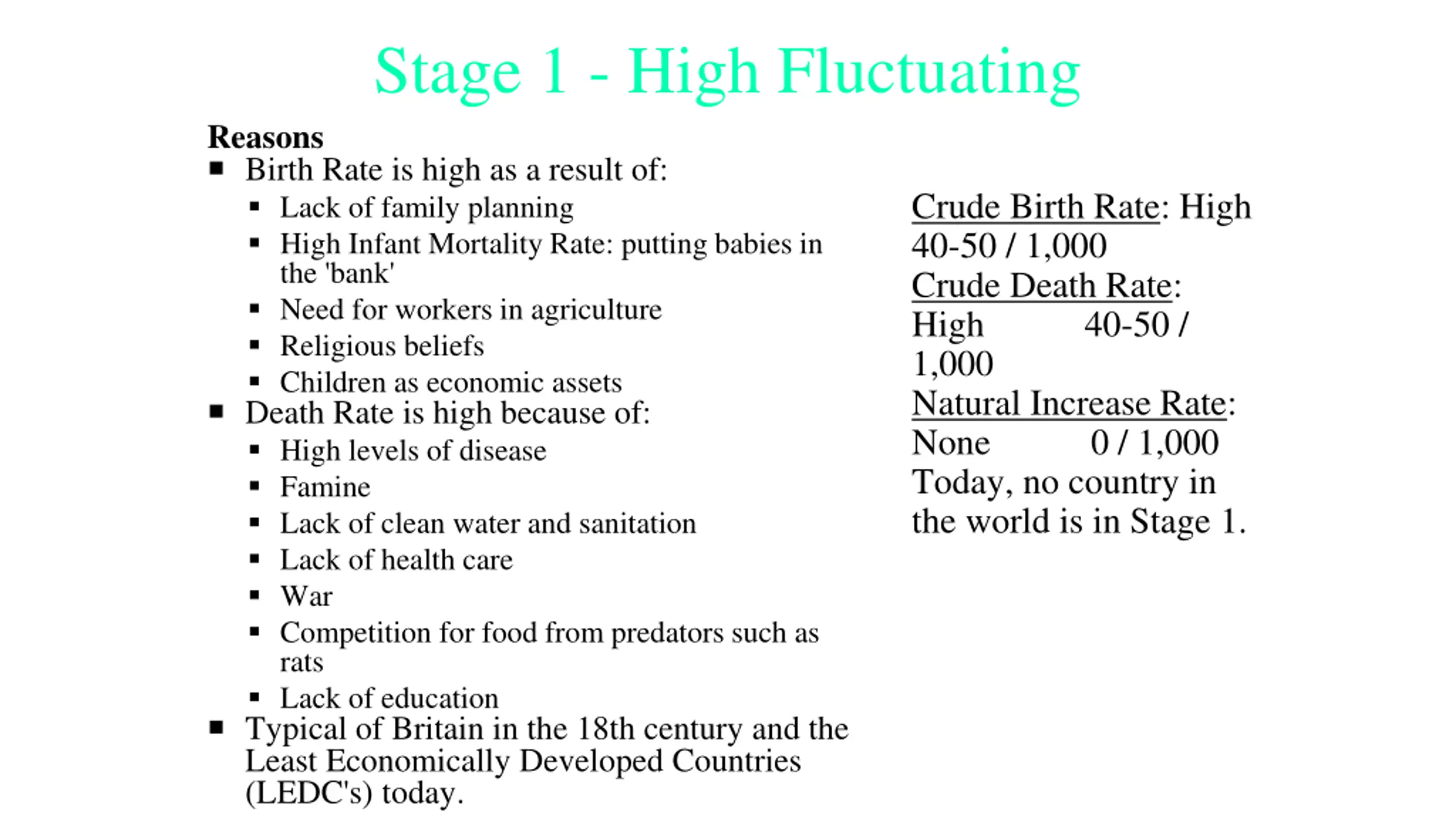 Stage 1 - High Fluctuating Reasons Birth Rate is high as a result of: Lack of family planning High Infant Mortality Rate: putting babies in the 'bank' Need for workers in agriculture Religious beliefs Children as economic assets Death Rate is high because of: High levels of disease Famine Lack of clean water and sanitation Lack of health care War Competition for food from predators such as rats Lack of education Typical of Britain in the 18th century and the Least Economically Developed Countries (LEDC's) today. Crude Birth Rate: High 40-50 / 1,000 Crude Death Rate: High 40-50 / 1,000 Natural Increase Rate: None 0 / 1,000 Today, no country in the world is in Stage 1.