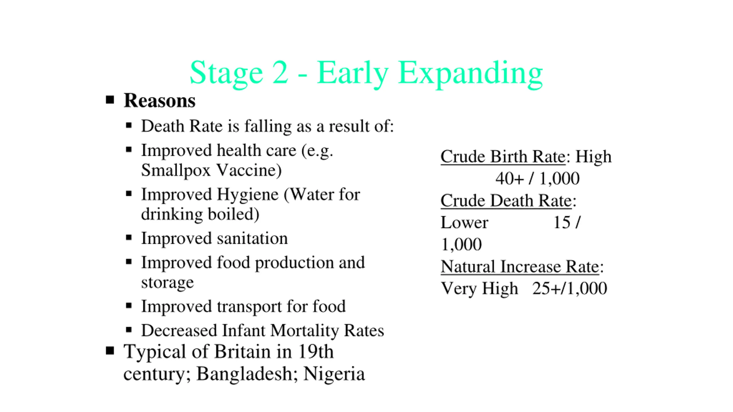 Stage 2 - Early Expanding Reasons Death Rate is falling as a result of: Improved health care (e.g. Smallpox Vaccine) Improved Hygiene (Water for drinking boiled) Improved sanitation Improved food production and storage Improved transport for food Decreased Infant Mortality Rates Typical of Britain in 19th century; Bangladesh; Nigeria Crude Birth Rate: High 40+ / 1,000 Crude Death Rate: Lower 15 / 1,000 Natural Increase Rate: Very High 25+/1,000