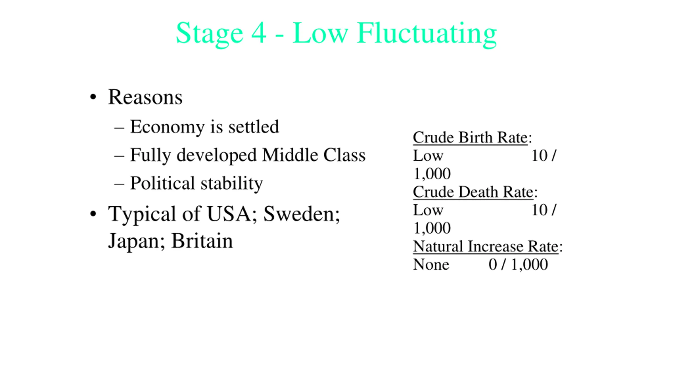 Stage 4 - Low Fluctuating Reasons Economy is settled Fully developed Middle Class Political stability Typical of USA; Sweden; Japan; Britain Crude Birth Rate: Low 1,000 Crude Death Rate: Low 1,000 Natural Increase Rate: None 0 / 1,000 10 / 10 /