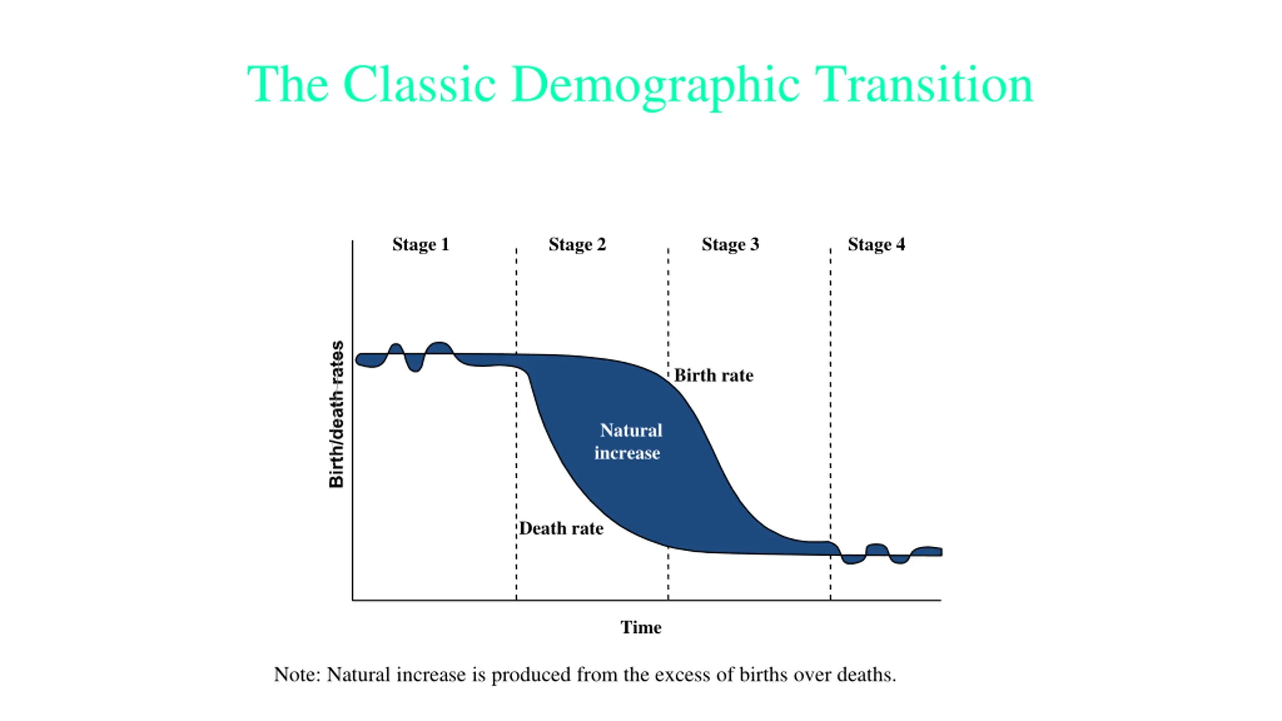 The Classic Demographic Transition Stage 1 Stage 2 Stage 3 Stage 4 Birth rate Natural increase Death rate Time Note: Natural increase is produced from the excess of births over deaths.