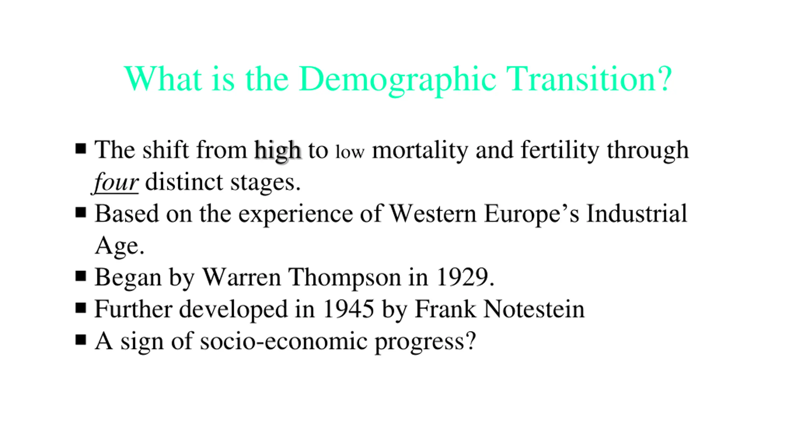 What is the Demographic Transition? The shift from high to low mortality and fertility through four distinct stages. Based on the experience of Western Europe s Industrial Age. Began by Warren Thompson in 1929. Further developed in 1945 by Frank Notestein A sign of socio-economic progress?