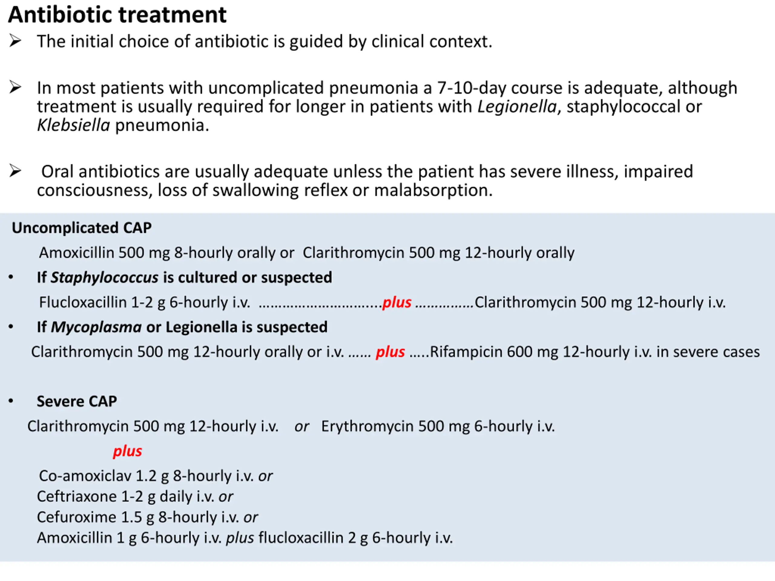 Antibiotic treatment The initial choice of antibiotic is guided by clinical context. In most patients with uncomplicated pneumonia a 7-10-day course is adequate, although treatment is usually required for longer in patients with Legionella, staphylococcal or Klebsiella pneumonia. Oral antibiotics are usually adequate unless the patient has severe illness, impaired consciousness, loss of swallowing reflex or malabsorption. Uncomplicated CAP Amoxicillin 500 mg 8-hourly orally or Clarithromycin 500 mg 12-hourly orally If Staphylococcus is cultured or suspected Flucloxacillin 1-2 g 6-hourly i.v. ....plus Clarithromycin 500 mg 12-hourly i.v. If Mycoplasma or Legionella is suspected Clarithromycin 500 mg 12-hourly orally or i.v. plus ..Rifampicin 600 mg 12-hourly i.v. in severe cases Clarithromycin 500 mg 12-hourly i.v. or Erythromycin 500 mg 6-hourly i.v. plus Co-amoxiclav 1.2 g 8-hourly i.v. or Ceftriaxone 1-2 g daily i.v. or Cefuroxime 1.5 g 8-hourly i.v. or Amoxicillin 1 g 6-hourly i.v. plus flucloxacillin 2 g 6-hourly i.v. Severe CAP