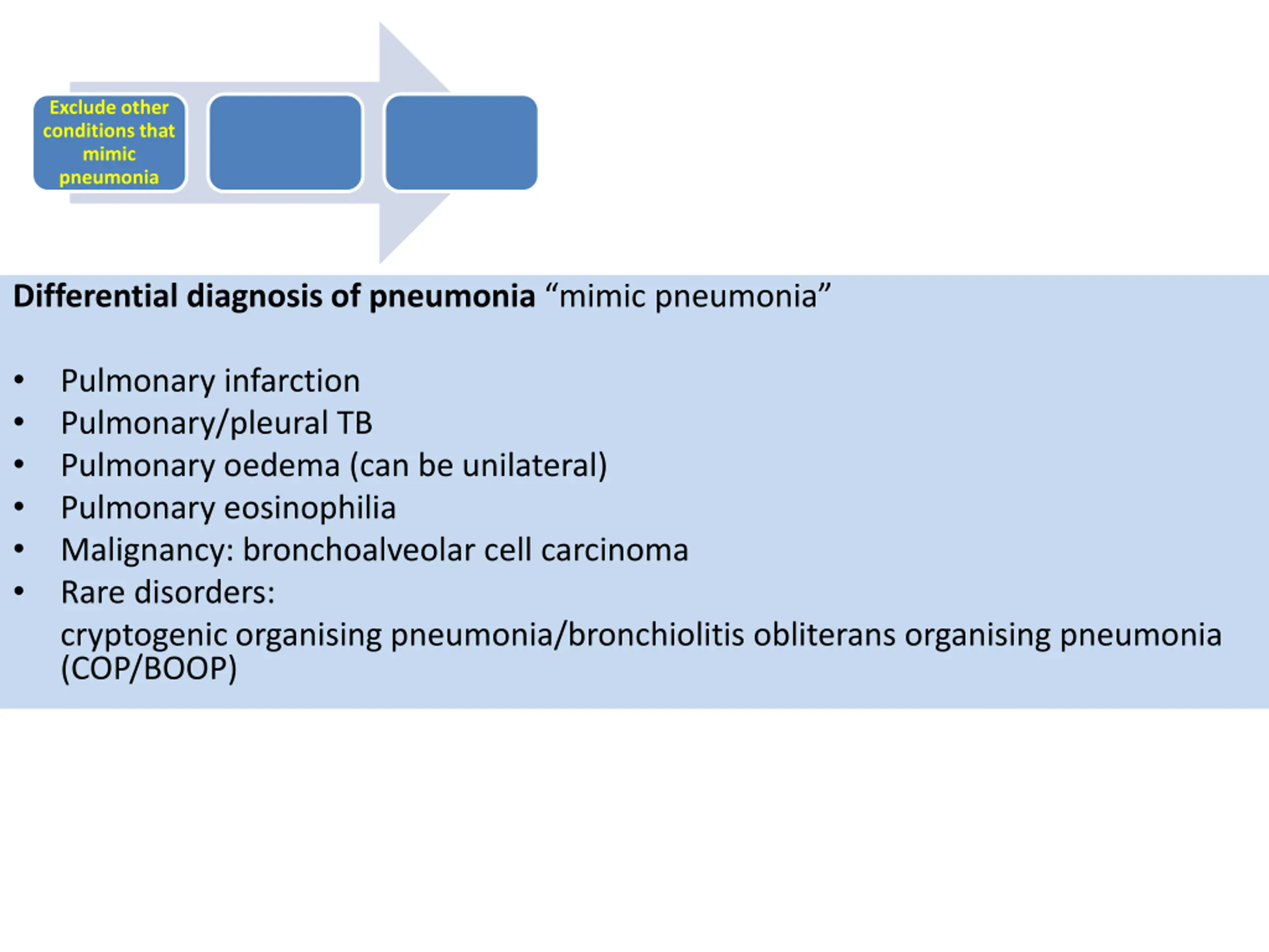 Exclude other conditions that mimic pneumonia Differential diagnosis of pneumonia mimic pneumonia cryptogenic organising pneumonia/bronchiolitis obliterans organising pneumonia (COP/BOOP) Pulmonary infarction Pulmonary/pleural TB Pulmonary oedema (can be unilateral) Pulmonary eosinophilia Malignancy: bronchoalveolar cell carcinoma Rare disorders: