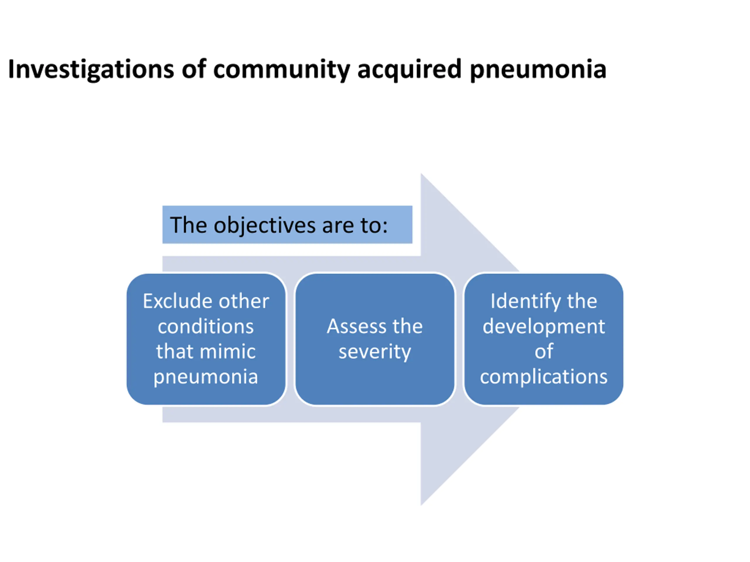 Investigations of community acquired pneumonia The objectives are to: Exclude other conditions that mimic pneumonia Identify the development of complications Assess the severity