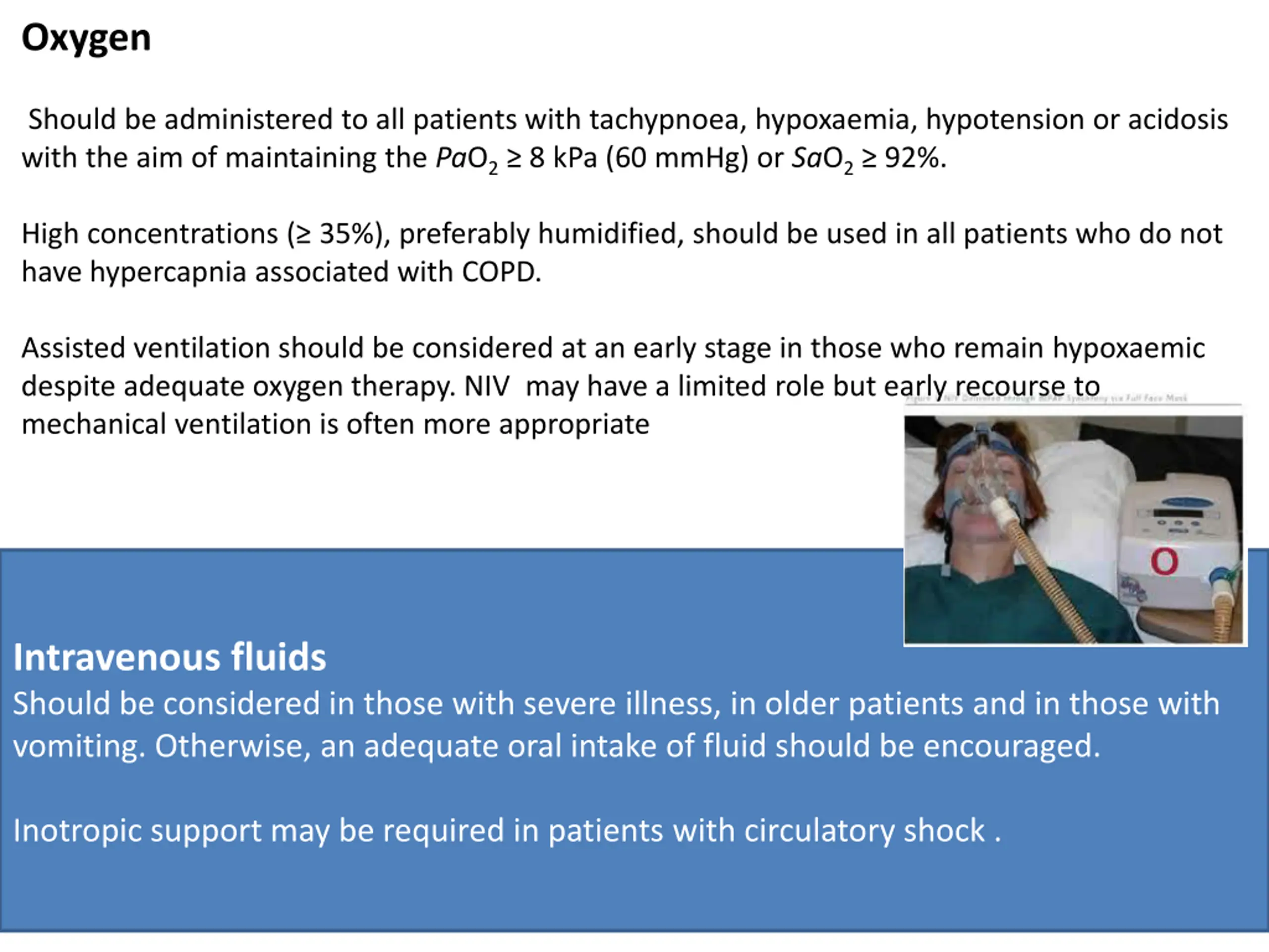 Oxygen Should be administered to all patients with tachypnoea, hypoxaemia, hypotension or acidosis with the aim of maintaining the PaO2 8 kPa (60 mmHg) or SaO2 92%. High concentrations ( 35%), preferably humidified, should be used in all patients who do not have hypercapnia associated with COPD. Assisted ventilation should be considered at an early stage in those who remain hypoxaemic despite adequate oxygen therapy. NIV may have a limited role but early recourse to mechanical ventilation is often more appropriate Intravenous fluids Should be considered in those with severe illness, in older patients and in those with vomiting. Otherwise, an adequate oral intake of fluid should be encouraged. Inotropic support may be required in patients with circulatory shock .