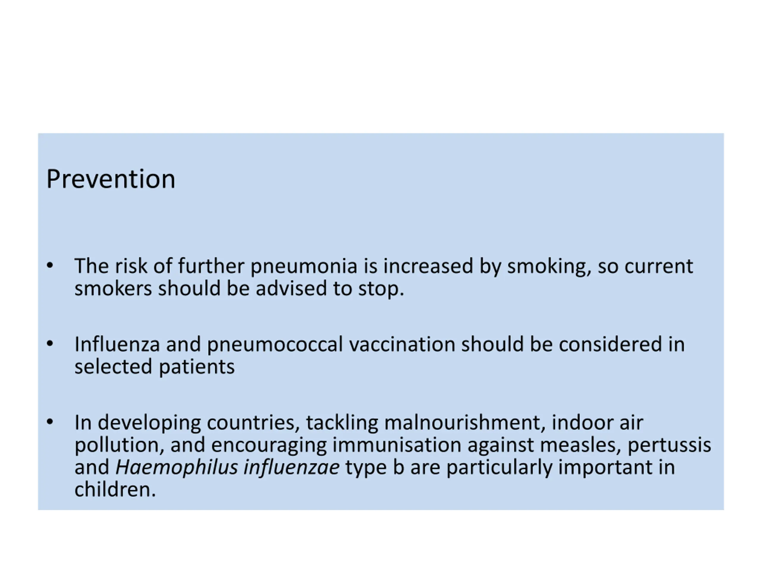 Prevention The risk of further pneumonia is increased by smoking, so current smokers should be advised to stop. Influenza and pneumococcal vaccination should be considered in selected patients In developing countries, tackling malnourishment, indoor air pollution, and encouraging immunisation against measles, pertussis and Haemophilus influenzae type b are particularly important in children.