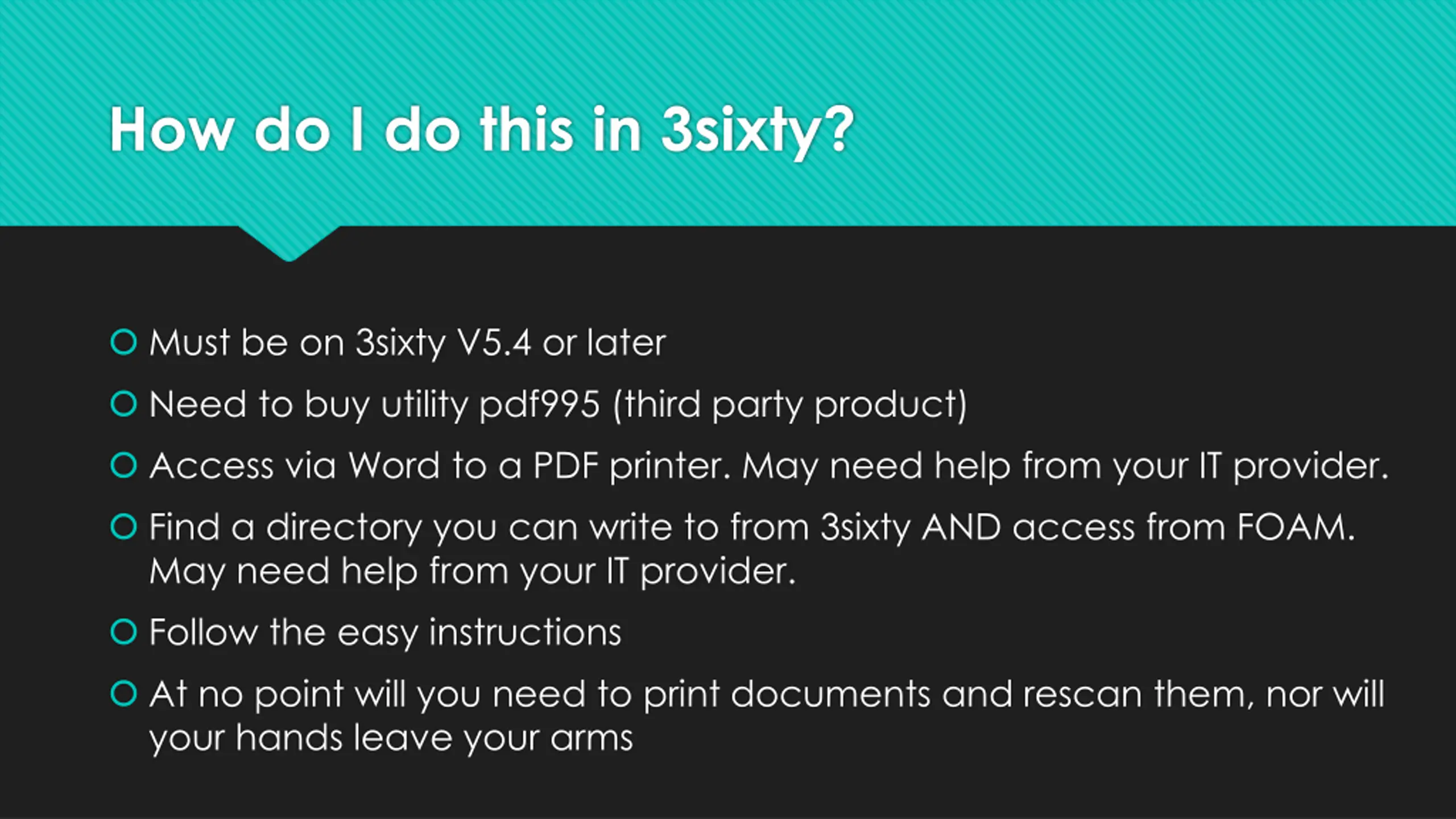 How do I do this in 3sixty? Must be on 3sixty V5.4 or later Need to buy utility pdf995 (third party product) Access via Word to a PDF printer. May need help from your IT provider. Find a directory you can write to from 3sixty AND access from FOAM. May need help from your IT provider. Follow the easy instructions At no point will you need to print documents and rescan them, nor will your hands leave your arms