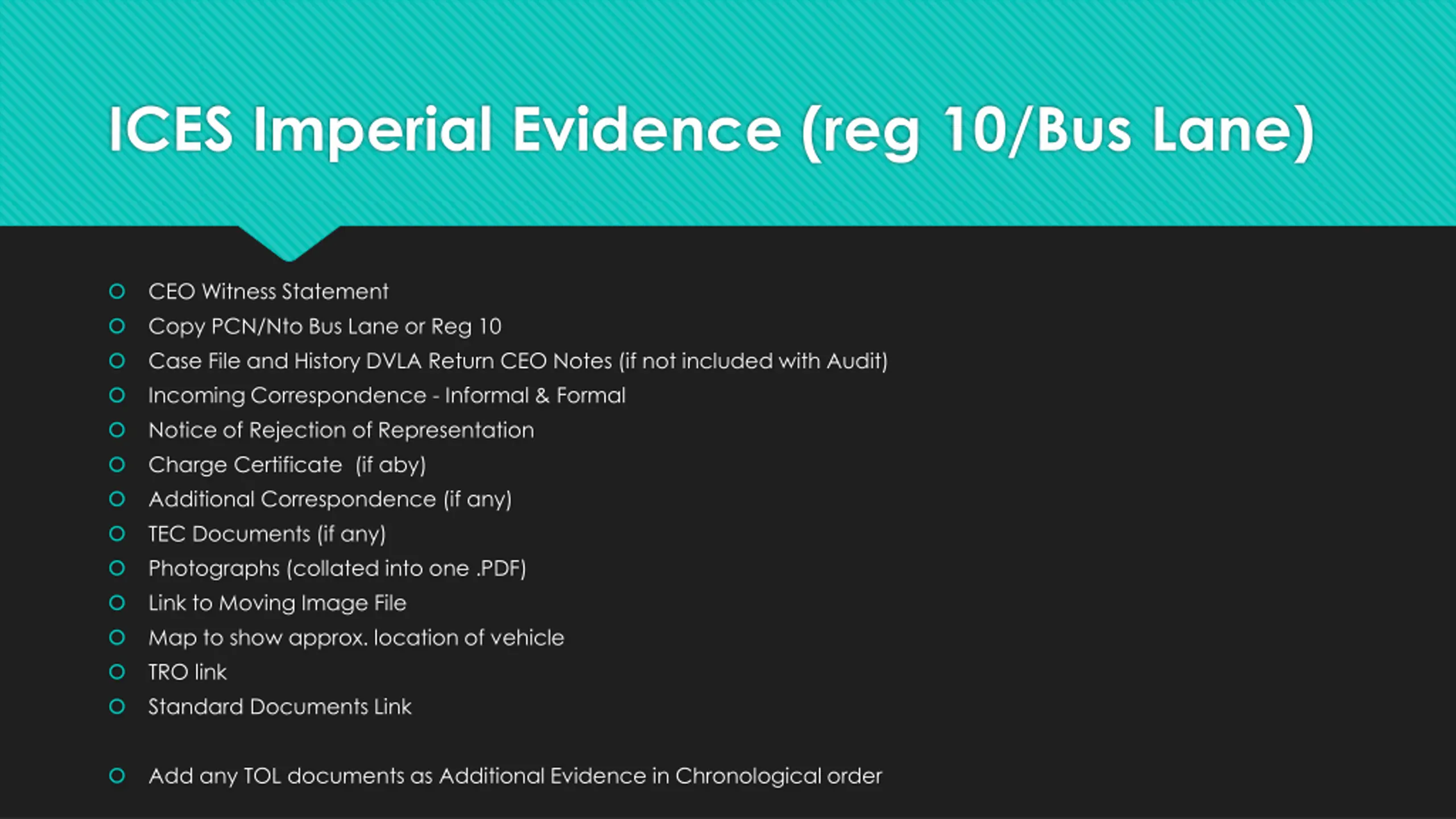 ICES Imperial Evidence (reg 10/Bus Lane) CEO Witness Statement Copy PCN/Nto Bus Lane or Reg 10 Case File and History DVLA Return CEO Notes (if not included with Audit) Incoming Correspondence - Informal & Formal Notice of Rejection of Representation Charge Certificate (if aby) Additional Correspondence (if any) TEC Documents (if any) Photographs (collated into one .PDF) Link to Moving Image File Map to show approx. location of vehicle TRO link Standard Documents Link Add any TOL documents as Additional Evidence in Chronological order