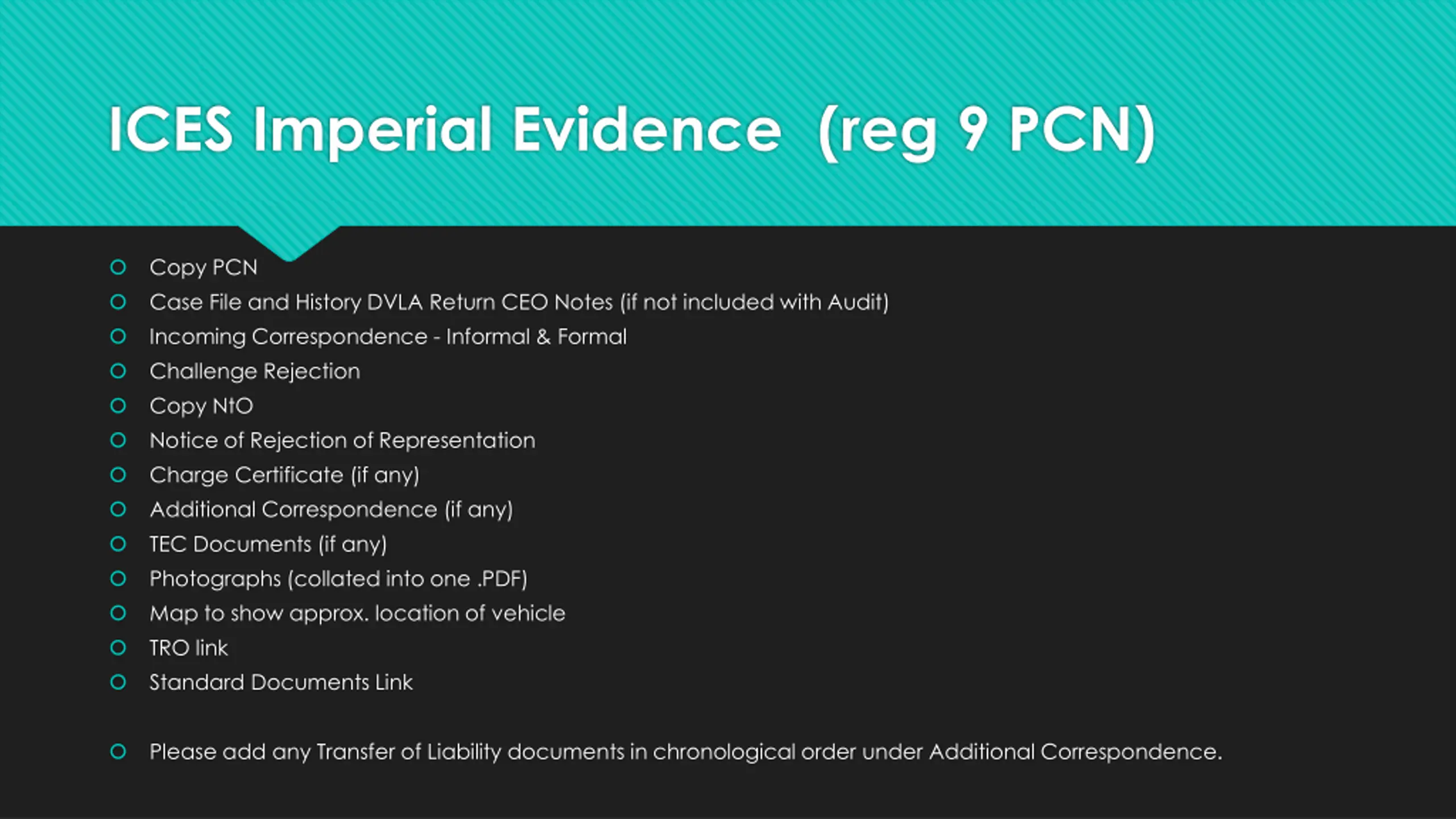 ICES Imperial Evidence (reg 9 PCN) Copy PCN Case File and History DVLA Return CEO Notes (if not included with Audit) Incoming Correspondence - Informal & Formal Challenge Rejection Copy NtO Notice of Rejection of Representation Charge Certificate (if any) Additional Correspondence (if any) TEC Documents (if any) Photographs (collated into one .PDF) Map to show approx. location of vehicle TRO link Standard Documents Link Please add any Transfer of Liability documents in chronological order under Additional Correspondence.