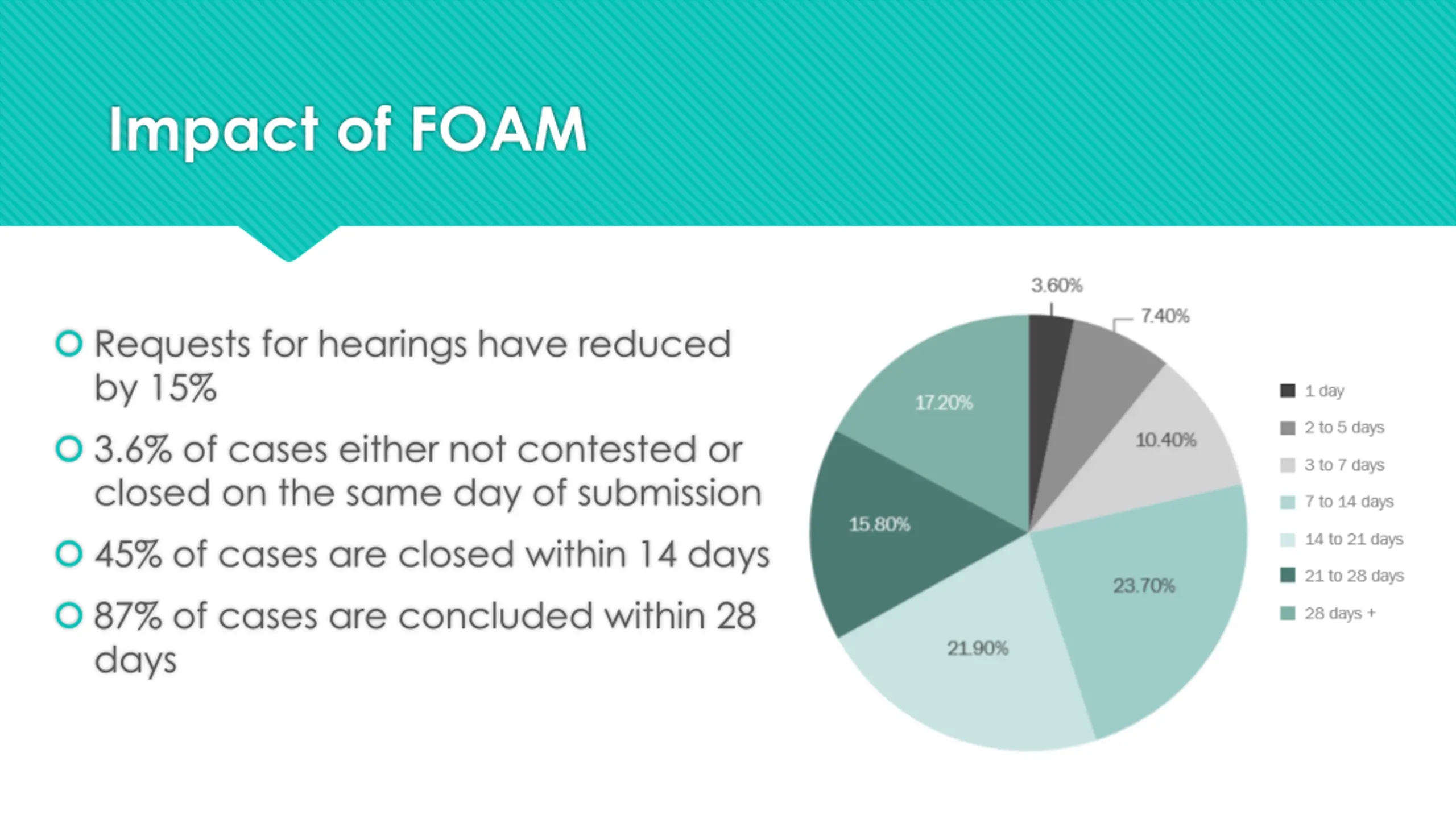Impact of FOAM Requests for hearings have reduced by 15% 3.6% of cases either not contested or closed on the same day of submission 45% of cases are closed within 14 days 87% of cases are concluded within 28 days