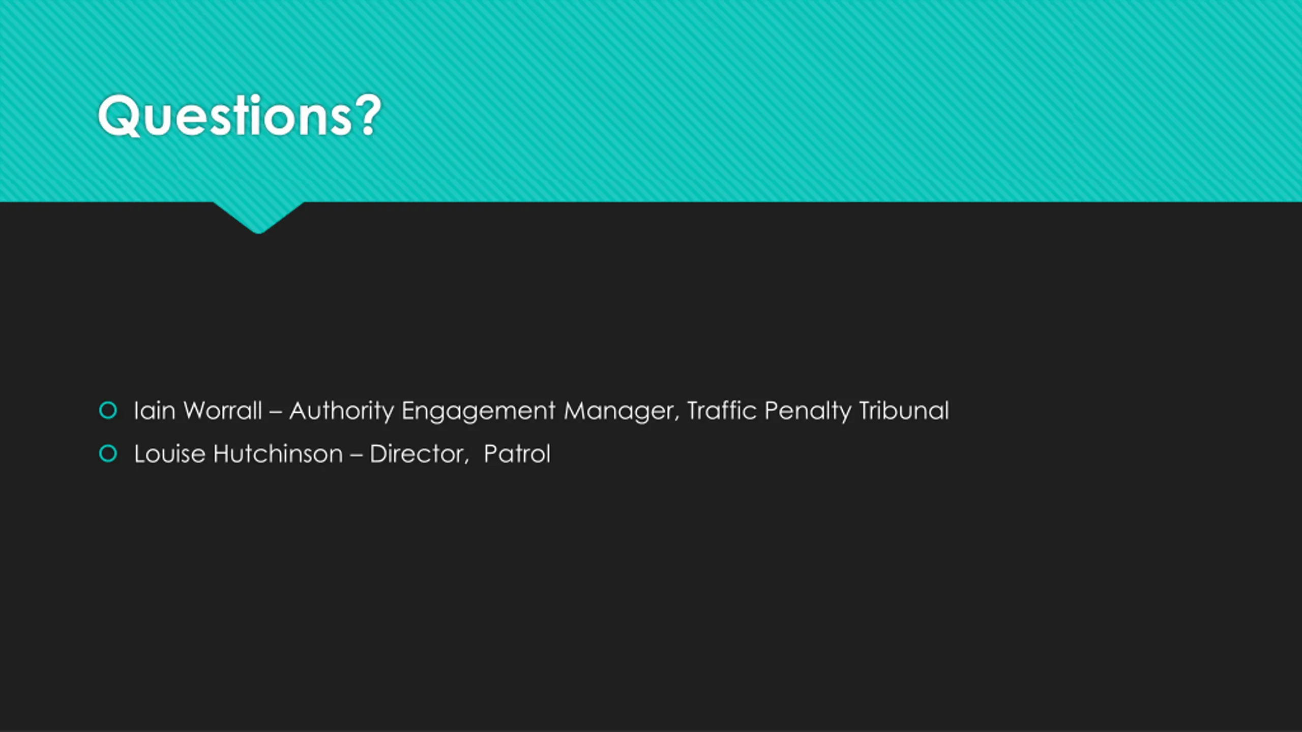 Questions? Iain Worrall Authority Engagement Manager, Traffic Penalty Tribunal Louise Hutchinson Director, Patrol