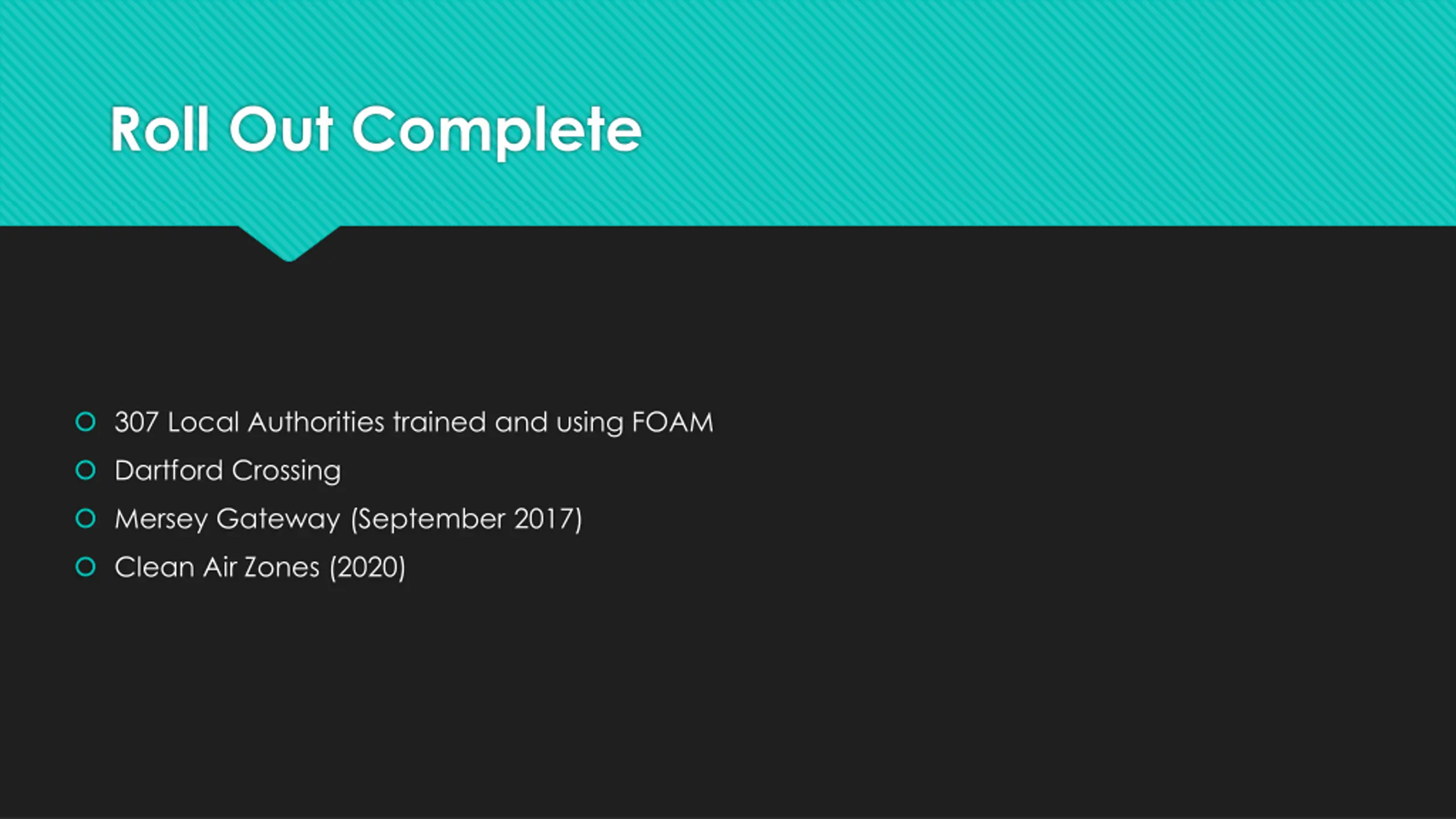 Roll Out Complete 307 Local Authorities trained and using FOAM Dartford Crossing Mersey Gateway (September 2017) Clean Air Zones (2020)