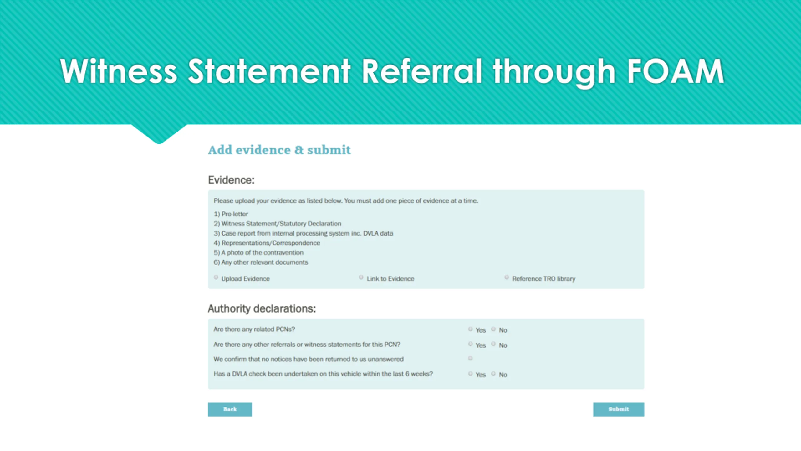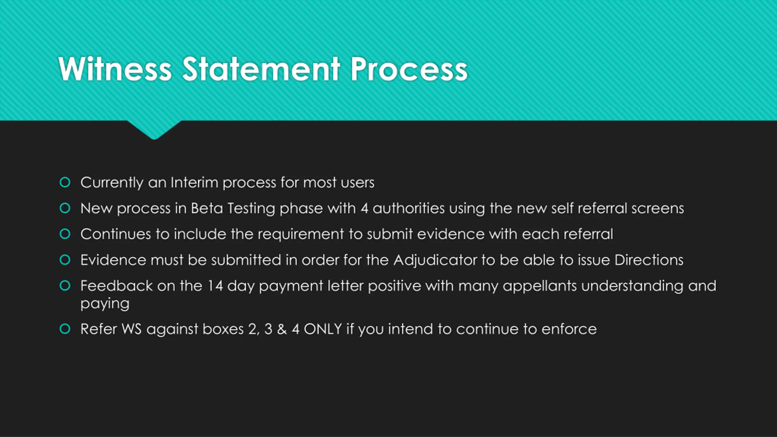 Witness Statement Process Currently an Interim process for most users New process in Beta Testing phase with 4 authorities using the new self referral screens Continues to include the requirement to submit evidence with each referral Evidence must be submitted in order for the Adjudicator to be able to issue Directions Feedback on the 14 day payment letter positive with many appellants understanding and paying Refer WS against boxes 2, 3 & 4 ONLY if you intend to continue to enforce