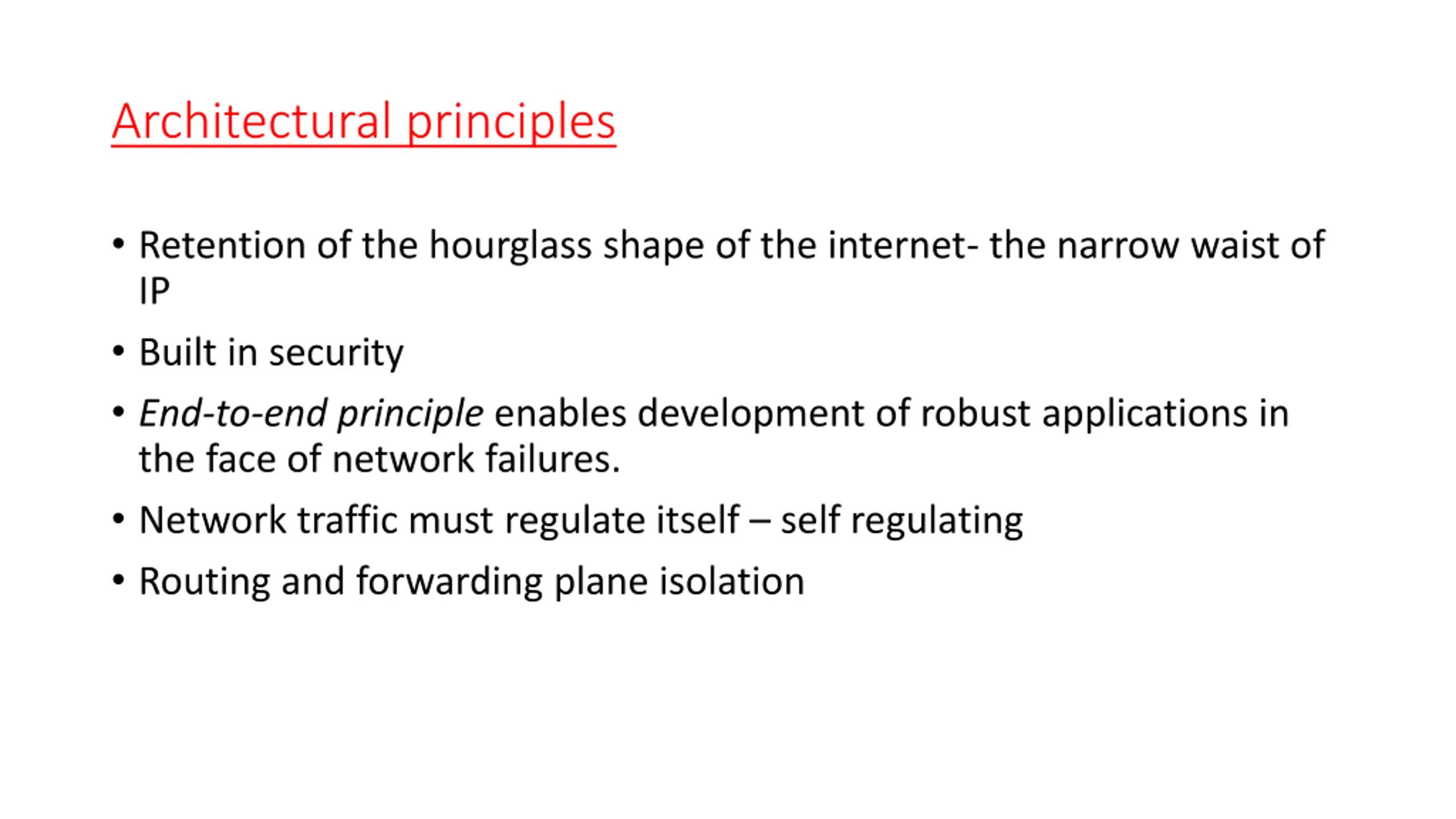 Architectural principles Retention of the hourglass shape of the internet- the narrow waist of IP Built in security End-to-end principle enables development of robust applications in the face of network failures. Network traffic must regulate itself self regulating Routing and forwarding plane isolation