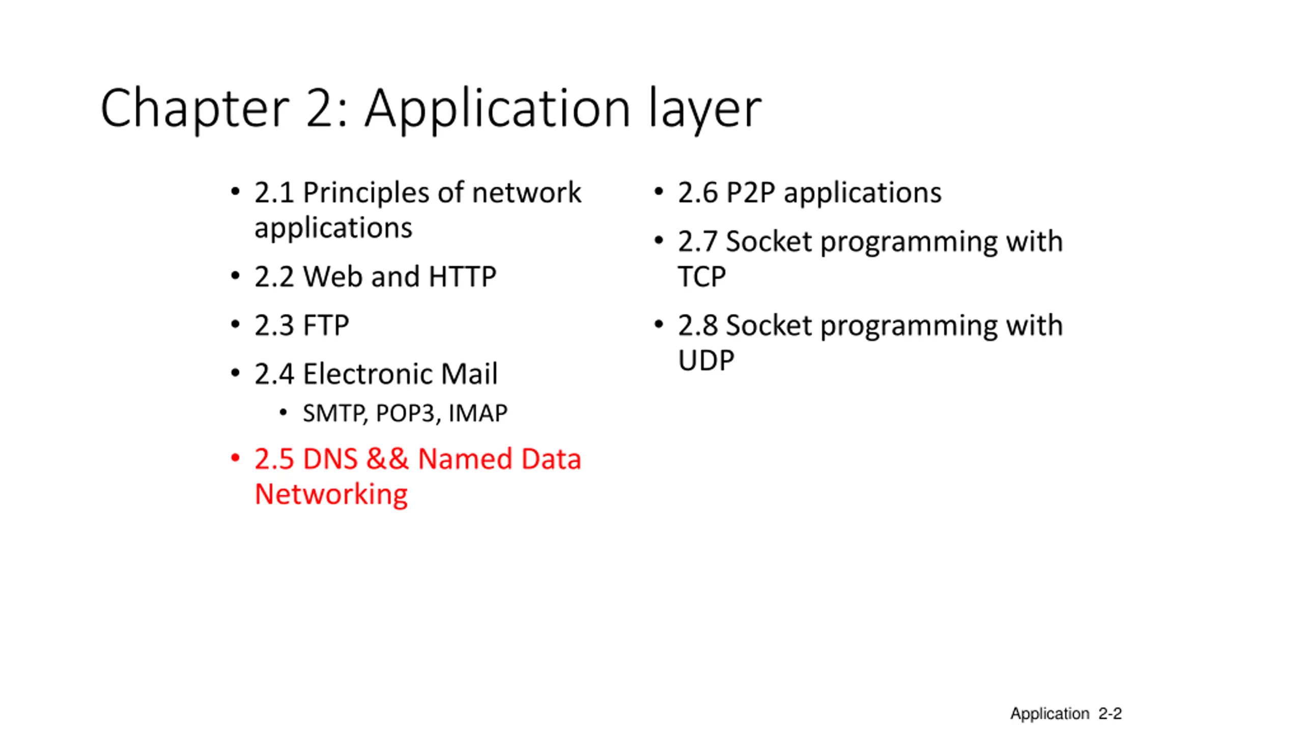 Chapter 2: Application layer 2.1 Principles of network applications 2.2 Web and HTTP 2.3 FTP 2.4 Electronic Mail SMTP, POP3, IMAP 2.5 DNS && Named Data Networking 2.6 P2P applications 2.7 Socket programming with TCP 2.8 Socket programming with UDP Application 2-2