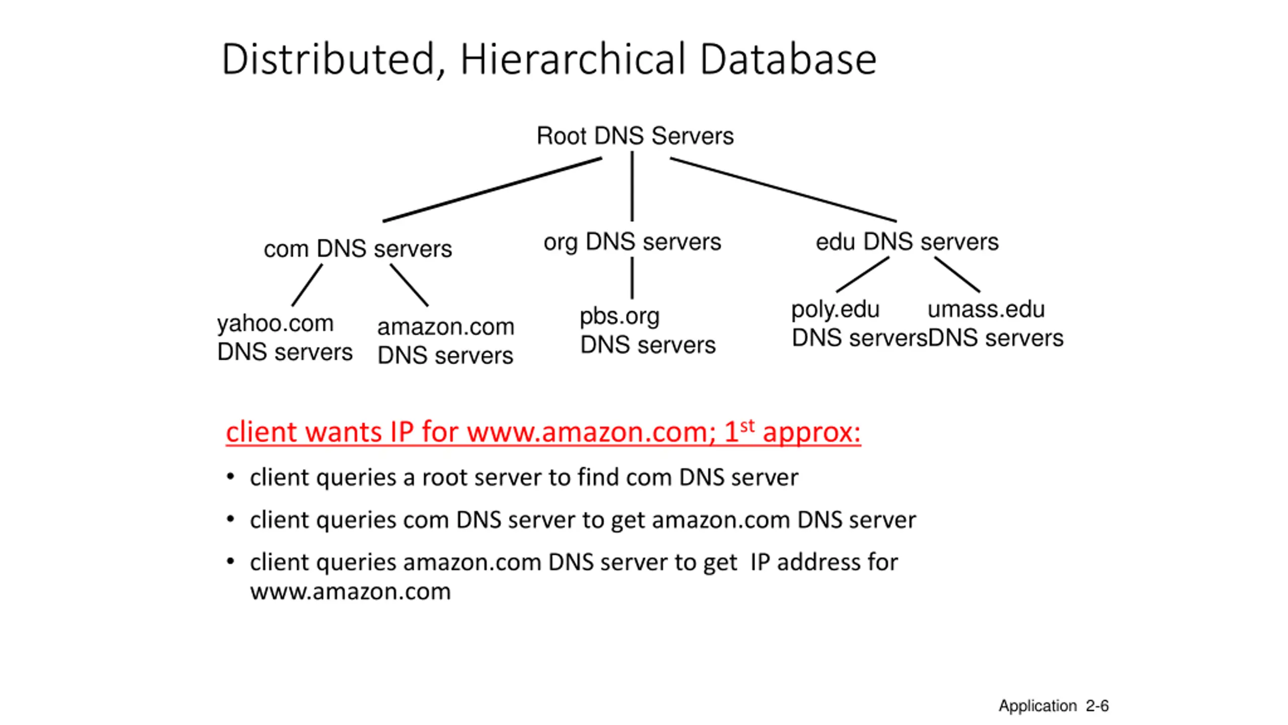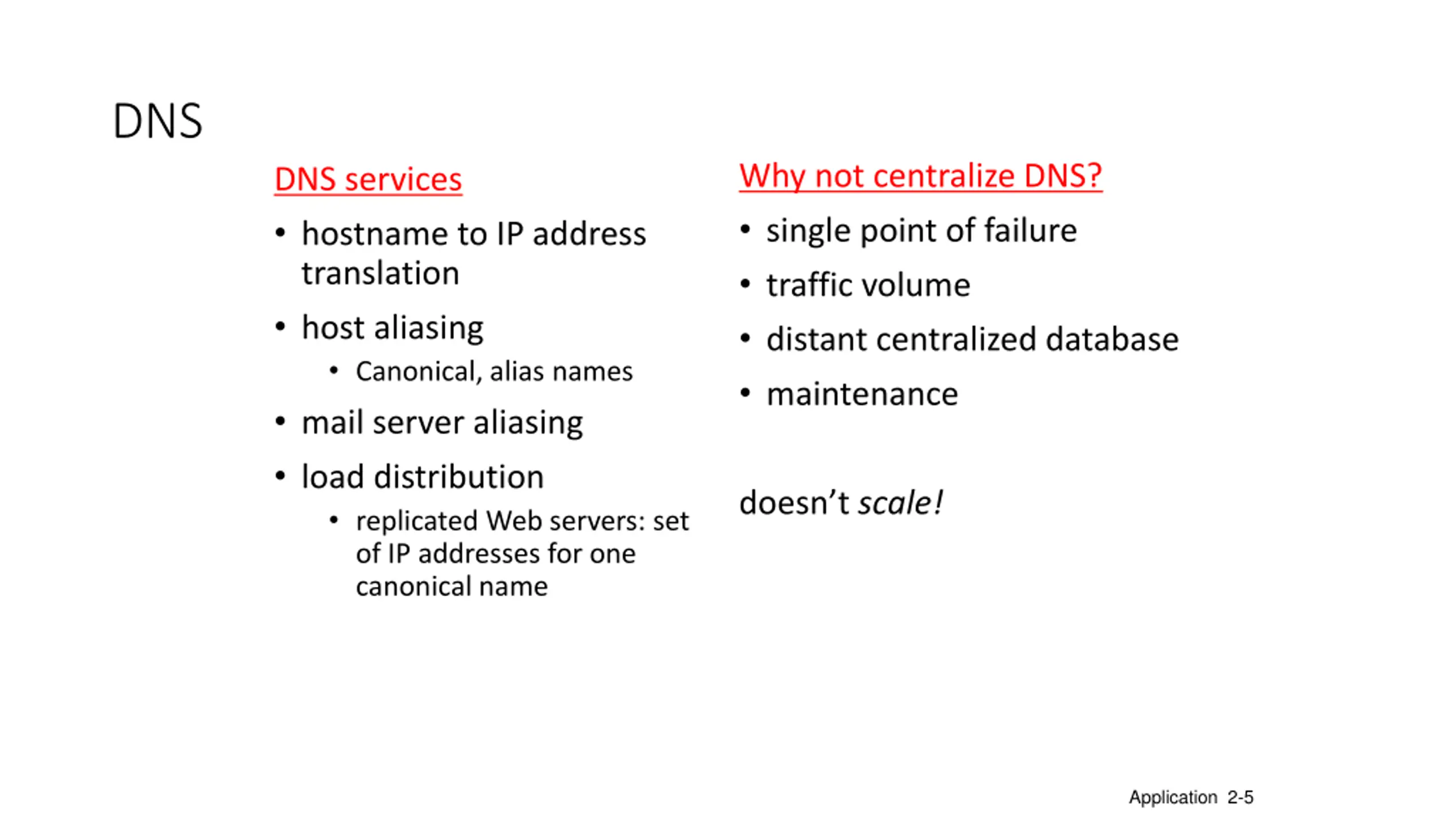 DNS Why not centralize DNS? single point of failure traffic volume distant centralized database maintenance DNS services hostname to IP address translation host aliasing Canonical, alias names mail server aliasing load distribution replicated Web servers: set of IP addresses for one canonical name doesn t scale! Application 2-5
