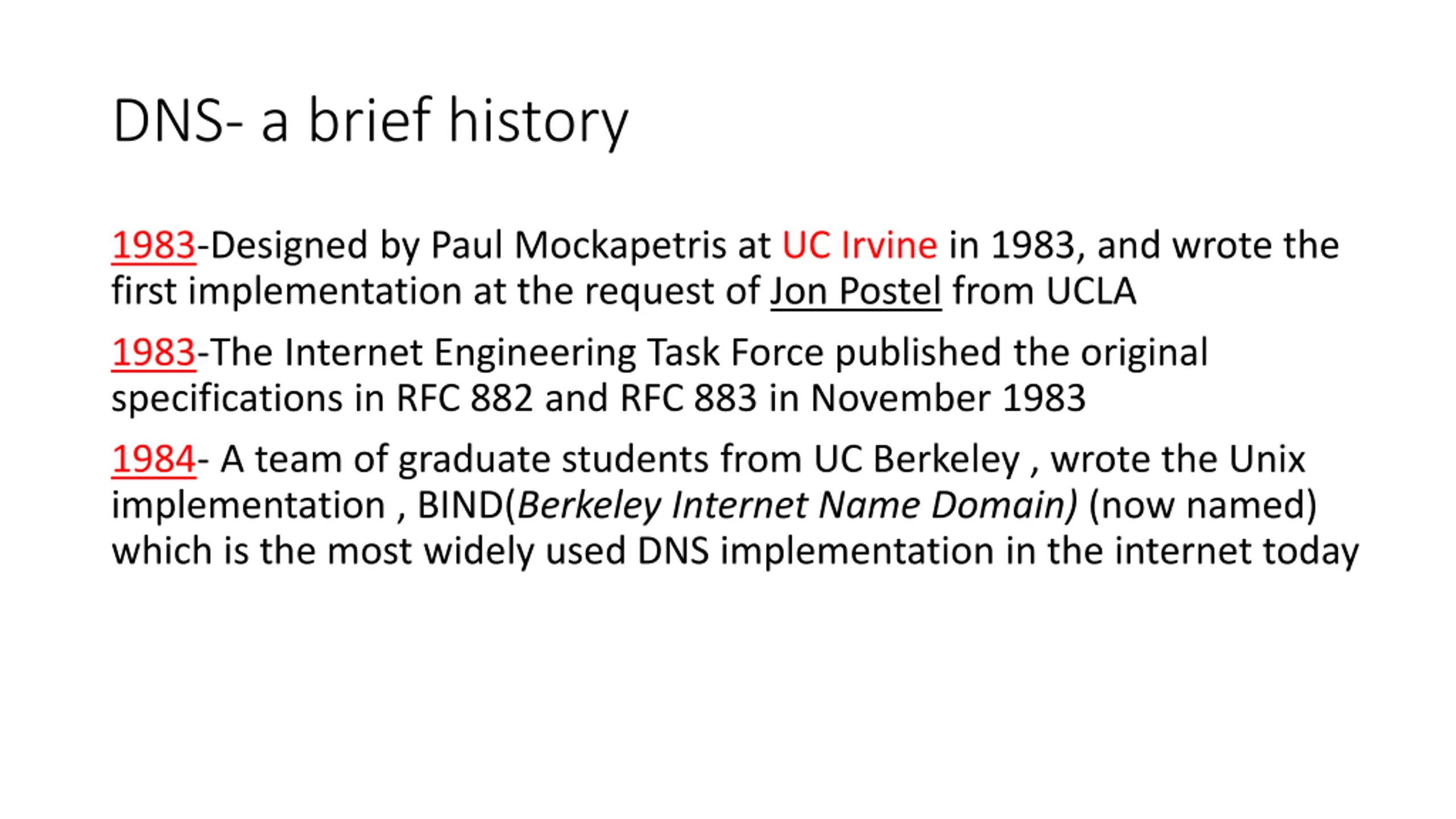 DNS- a brief history 1983-Designed by Paul Mockapetris at UC Irvine in 1983, and wrote the first implementation at the request of Jon Postel from UCLA 1983-The Internet Engineering Task Force published the original specifications in RFC 882 and RFC 883 in November 1983 1984- A team of graduate students from UC Berkeley , wrote the Unix implementation , BIND(Berkeley Internet Name Domain) (now named) which is the most widely used DNS implementation in the internet today