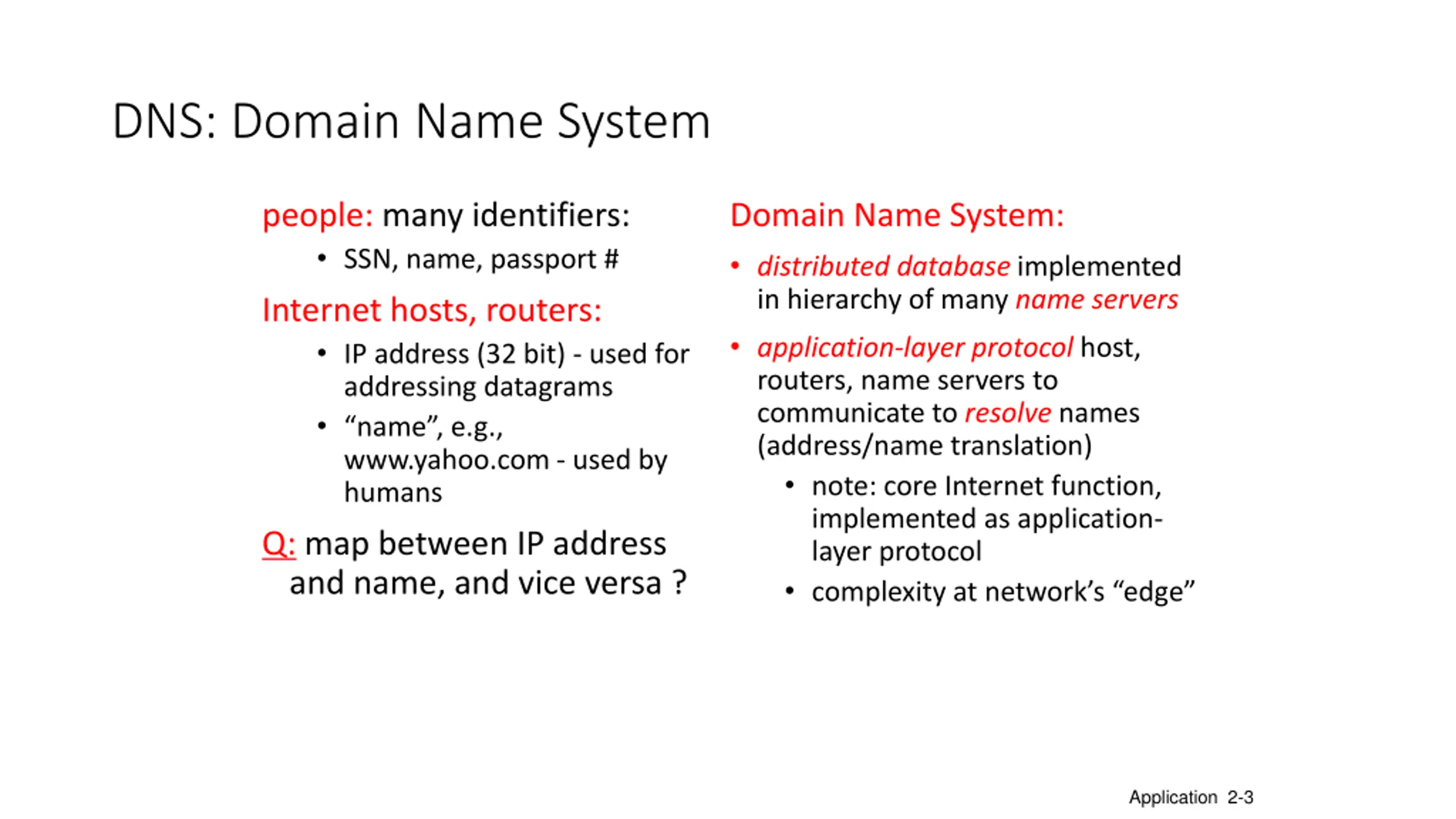 DNS: Domain Name System people: many identifiers: SSN, name, passport # Internet hosts, routers: IP address (32 bit) - used for addressing datagrams name , e.g., www.yahoo.com - used by humans Q: map between IP address and name, and vice versa ? Domain Name System: distributed database implemented in hierarchy of many name servers application-layer protocol host, routers, name servers to communicate to resolve names (address/name translation) note: core Internet function, implemented as application- layer protocol complexity at network s edge Application 2-3