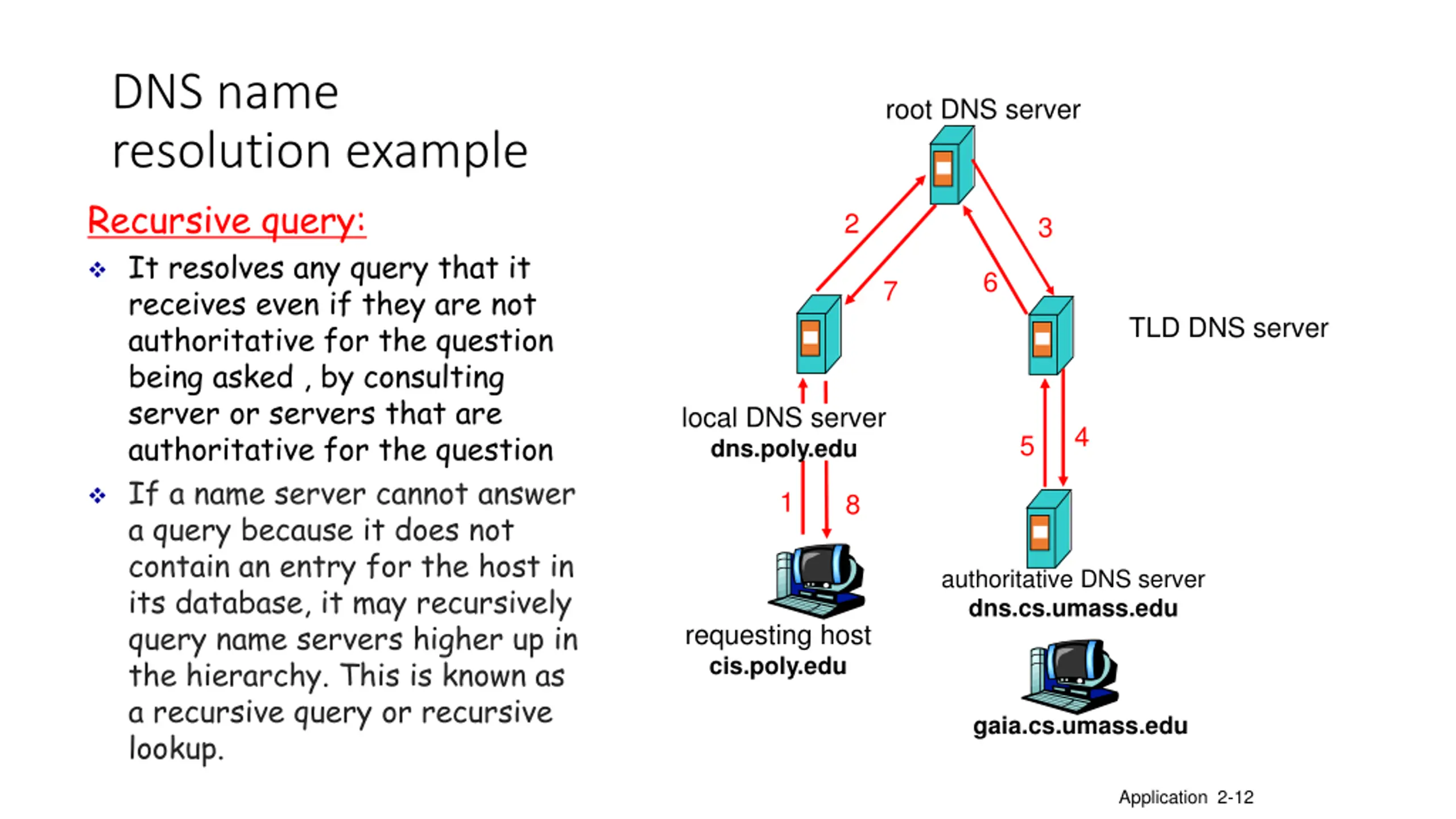 DNS name resolution example root DNS server Recursive query: It resolves any query that it receives even if they are not authoritative for the question being asked , by consulting server or servers that are authoritative for the question If a name server cannot answer a query because it does not contain an entry for the host in its database, it may recursively query name servers higher up in the hierarchy. This is known as a recursive query or recursive lookup. 2 3 6 7 TLD DNS server local DNS server dns.poly.edu 4 5 1 8 authoritative DNS server dns.cs.umass.edu requesting host cis.poly.edu gaia.cs.umass.edu Application 2-12