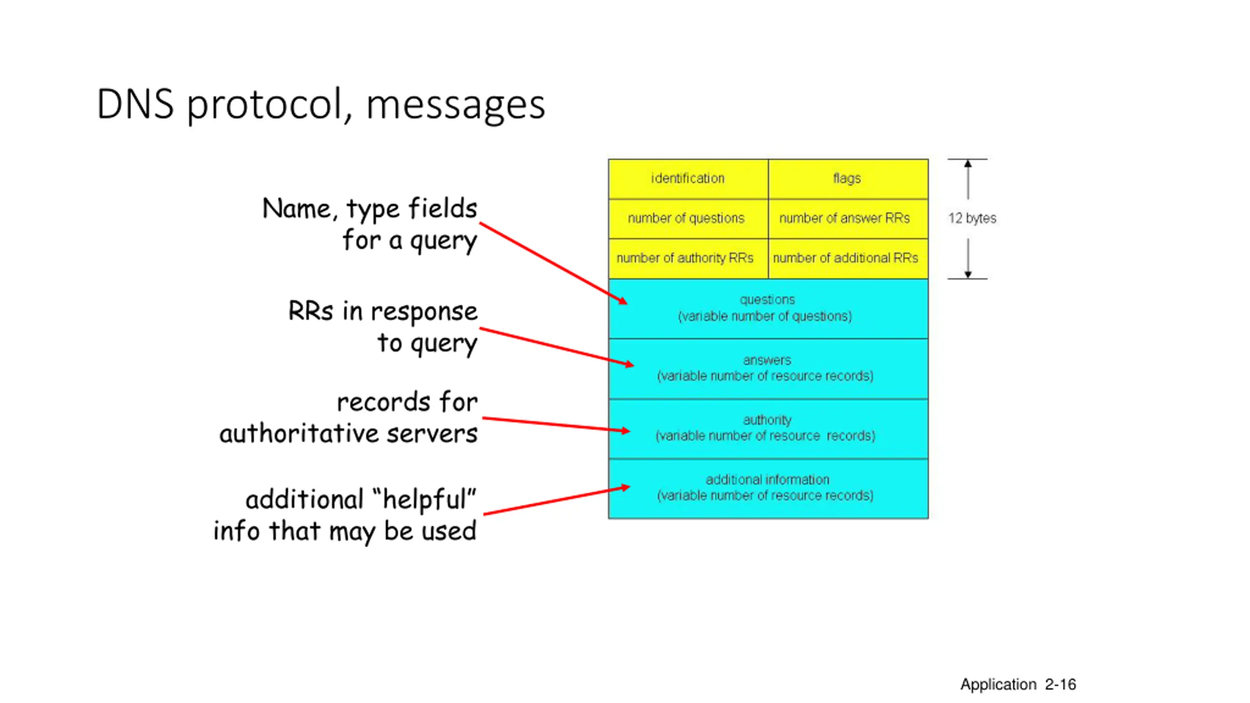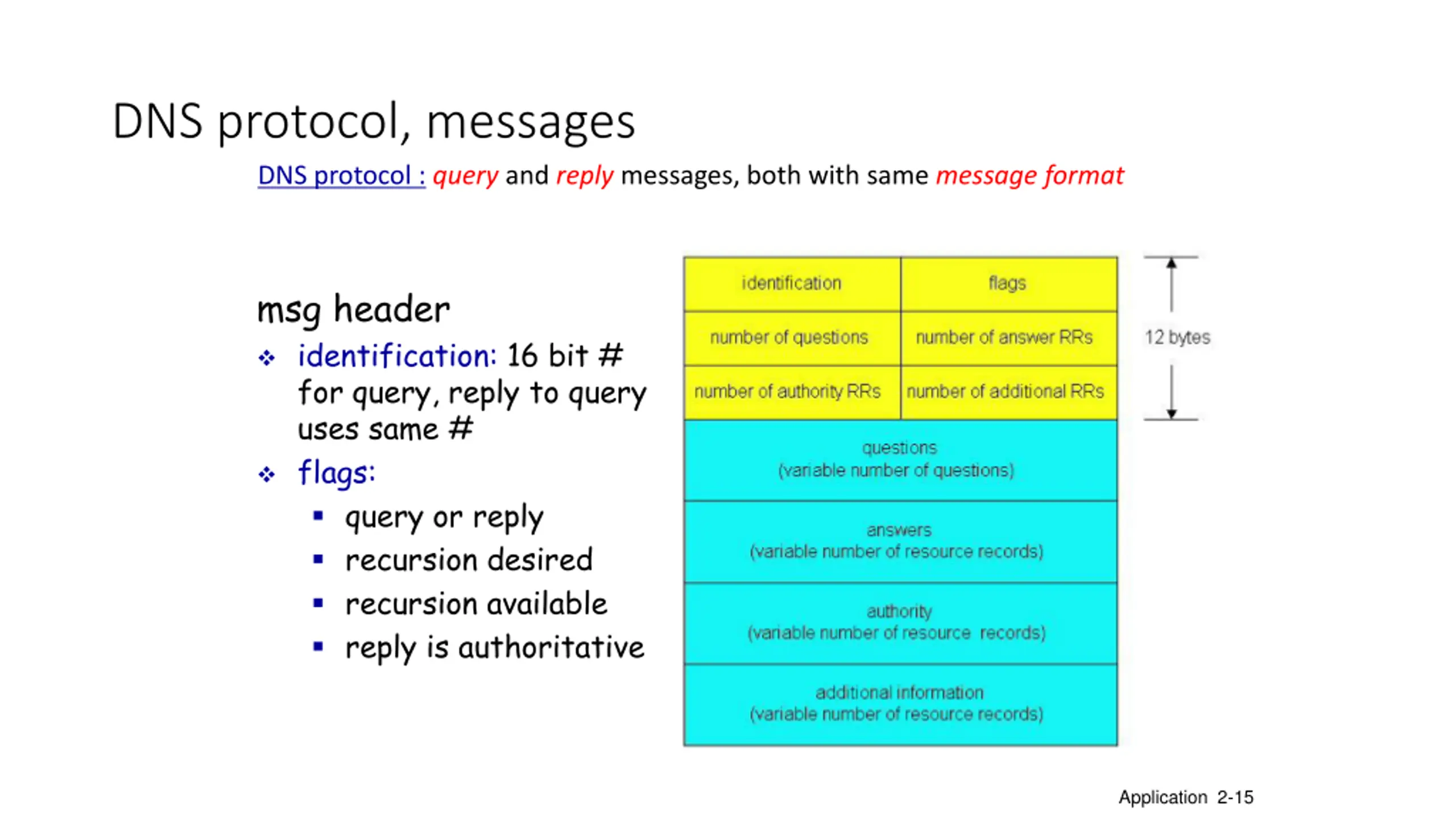 DNS protocol, messages DNS protocol : query and reply messages, both with same message format msg header identification: 16 bit # for query, reply to query uses same # flags: query or reply recursion desired recursion available reply is authoritative Application 2-15