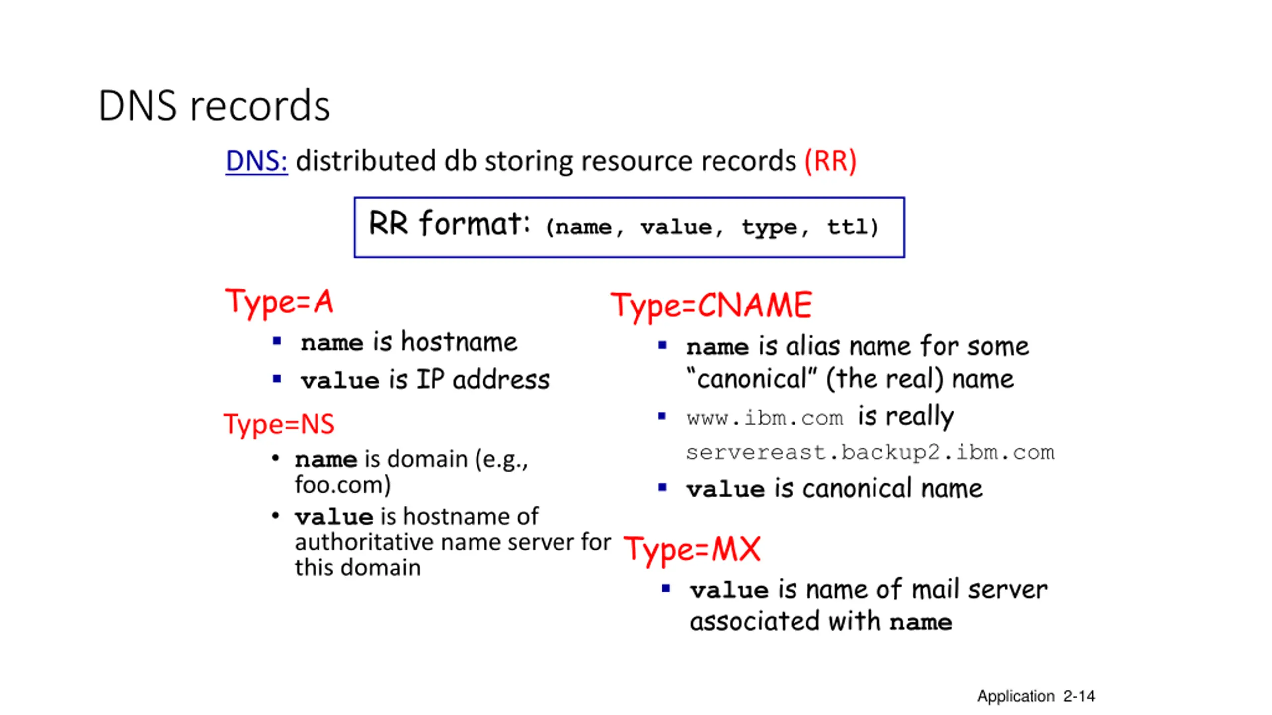 DNS records DNS: distributed db storing resource records (RR) RR format: (name, value, type, ttl) Type=A name is hostname value is IP address Type=CNAME name is alias name for some canonical (the real) name www.ibm.com is really servereast.backup2.ibm.com value is canonical name Type=NS name is domain (e.g., foo.com) value is hostname of authoritative name server for this domain Type=MX value is name of mail server associated with name Application 2-14
