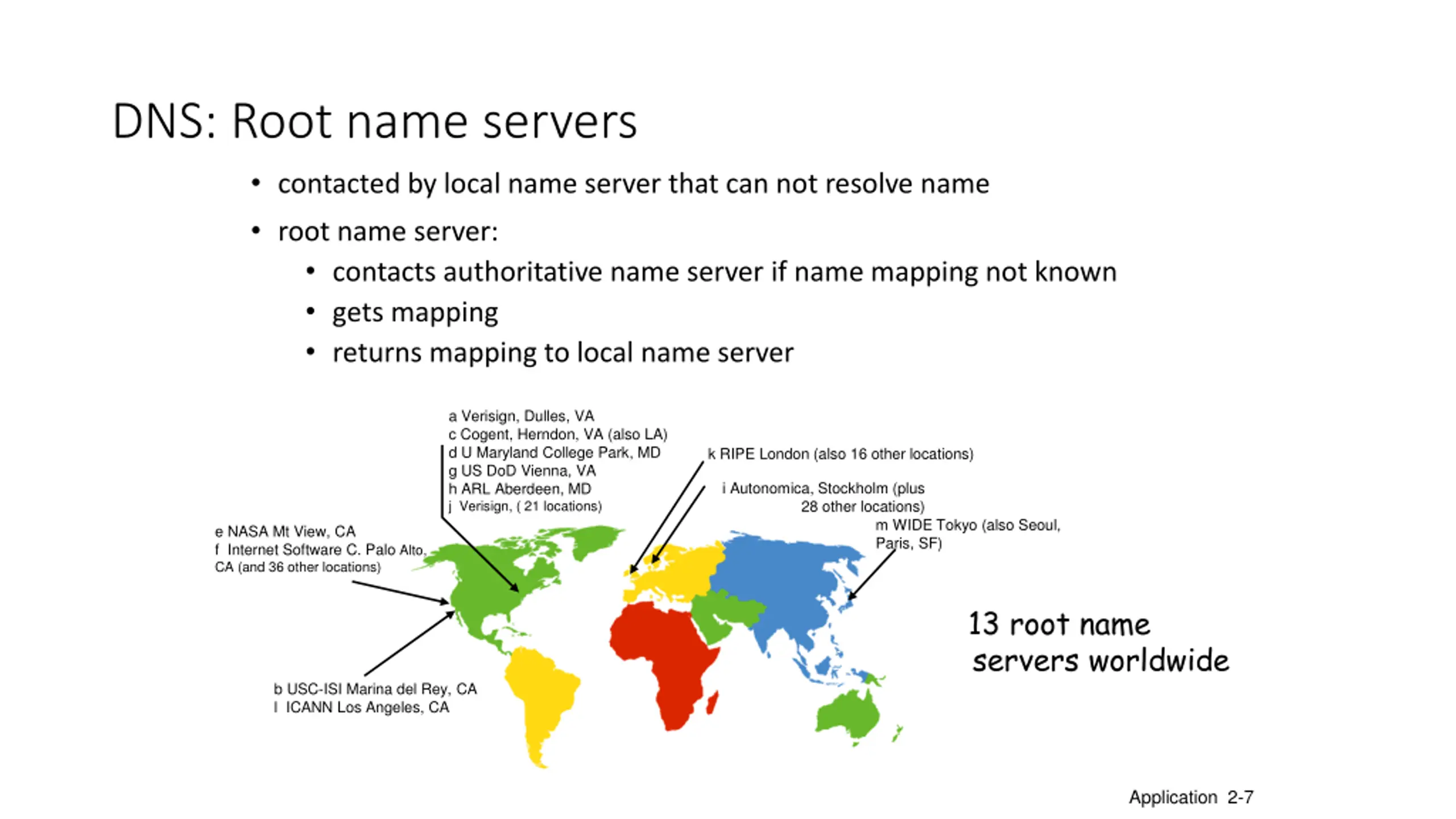 DNS: Root name servers contacted by local name server that can not resolve name root name server: contacts authoritative name server if name mapping not known gets mapping returns mapping to local name server a Verisign, Dulles, VA c Cogent, Herndon, VA (also LA) d U Maryland College Park, MD g US DoD Vienna, VA h ARL Aberdeen, MD j Verisign, ( 21 locations) k RIPE London (also 16 other locations) i Autonomica, Stockholm (plus 28 other locations) m WIDE Tokyo (also Seoul, Paris, SF) e NASA Mt View, CA f Internet Software C. Palo Alto, CA (and 36 other locations) 13 root name servers worldwide b USC-ISI Marina del Rey, CA l ICANN Los Angeles, CA Application 2-7