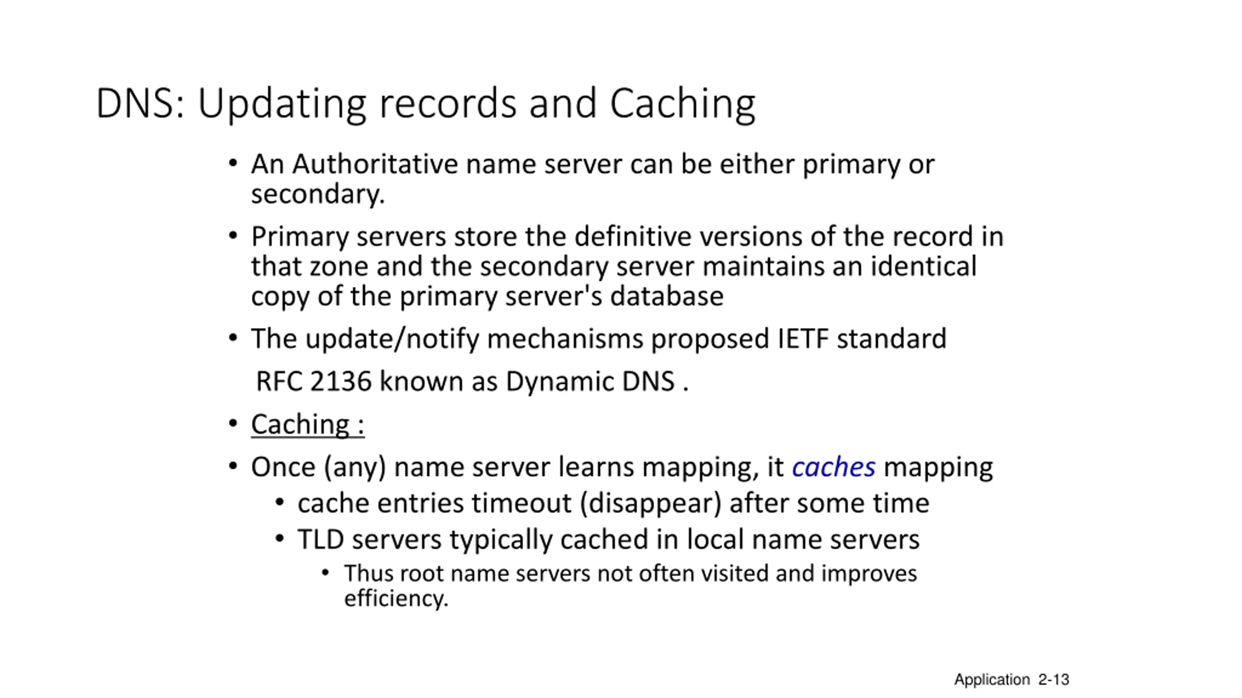 DNS: Updating records and Caching An Authoritative name server can be either primary or secondary. Primary servers store the definitive versions of the record in that zone and the secondary server maintains an identical copy of the primary server's database The update/notify mechanisms proposed IETF standard RFC 2136 known as Dynamic DNS . Caching : Once (any) name server learns mapping, it caches mapping cache entries timeout (disappear) after some time TLD servers typically cached in local name servers Thus root name servers not often visited and improves efficiency. Application 2-13
