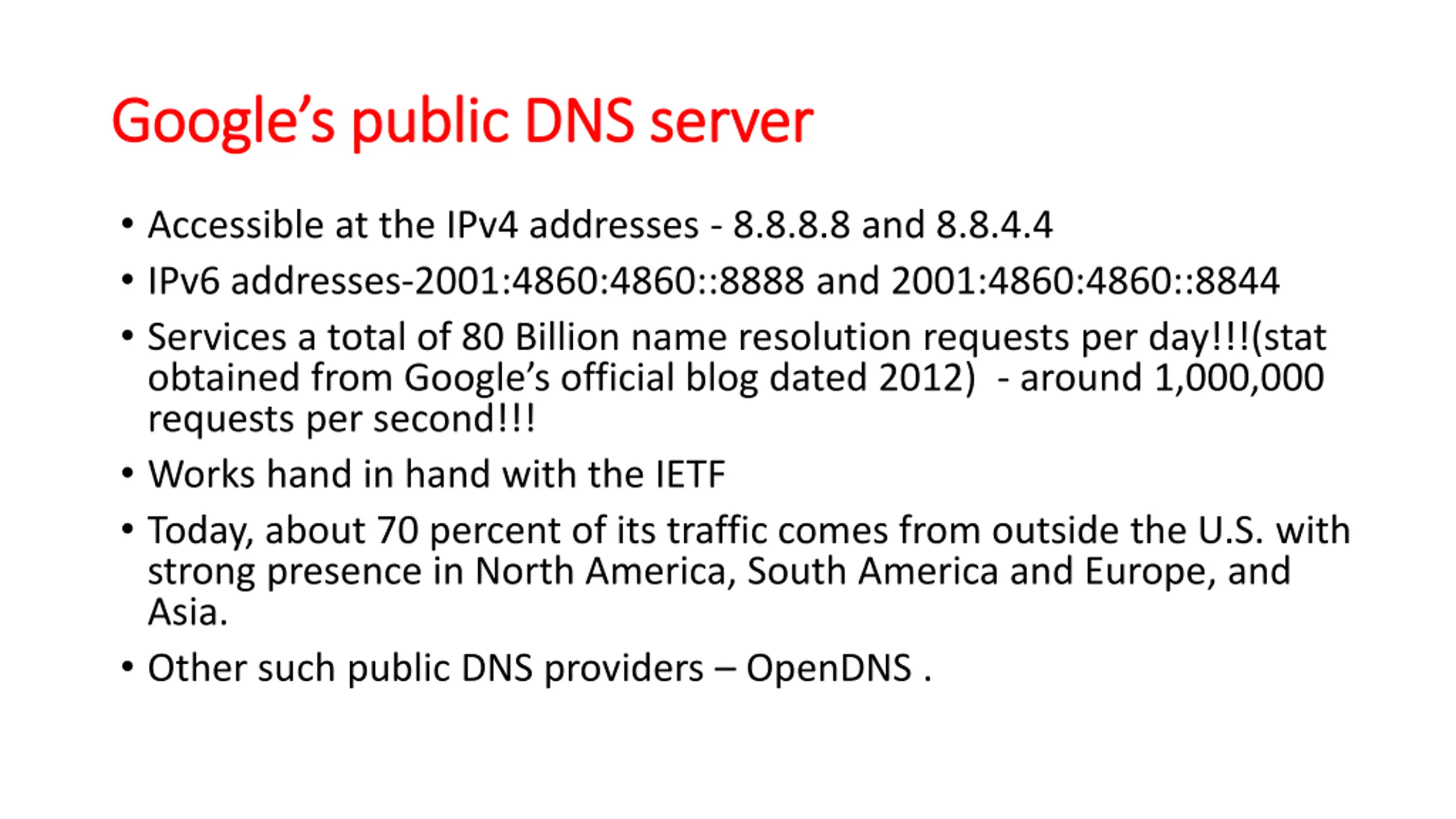 Googles public DNS server Google s public DNS server Accessible at the IPv4 addresses - 8.8.8.8 and 8.8.4.4 IPv6 addresses-2001:4860:4860::8888 and 2001:4860:4860::8844 Services a total of 80 Billion name resolution requests per day!!!(stat obtained from Google s official blog dated 2012) - around 1,000,000 requests per second!!! Works hand in hand with the IETF Today, about 70 percent of its traffic comes from outside the U.S. with strong presence in North America, South America and Europe, and Asia. Other such public DNS providers OpenDNS .