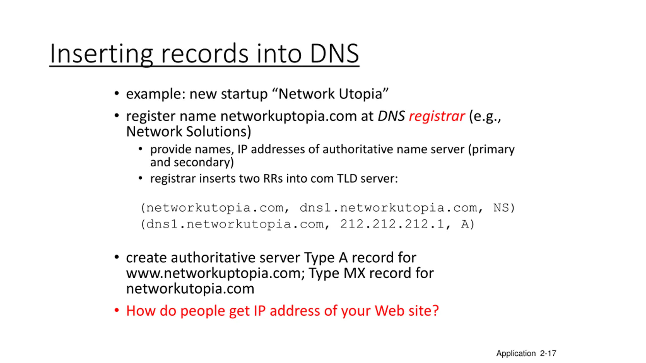 Inserting records into DNS example: new startup Network Utopia register name networkuptopia.com at DNS registrar (e.g., Network Solutions) provide names, IP addresses of authoritative name server (primary and secondary) registrar inserts two RRs into com TLD server: (networkutopia.com, dns1.networkutopia.com, NS) (dns1.networkutopia.com, 212.212.212.1, A) create authoritative server Type A record for www.networkuptopia.com; Type MX record for networkutopia.com How do people get IP address of your Web site? Application 2-17