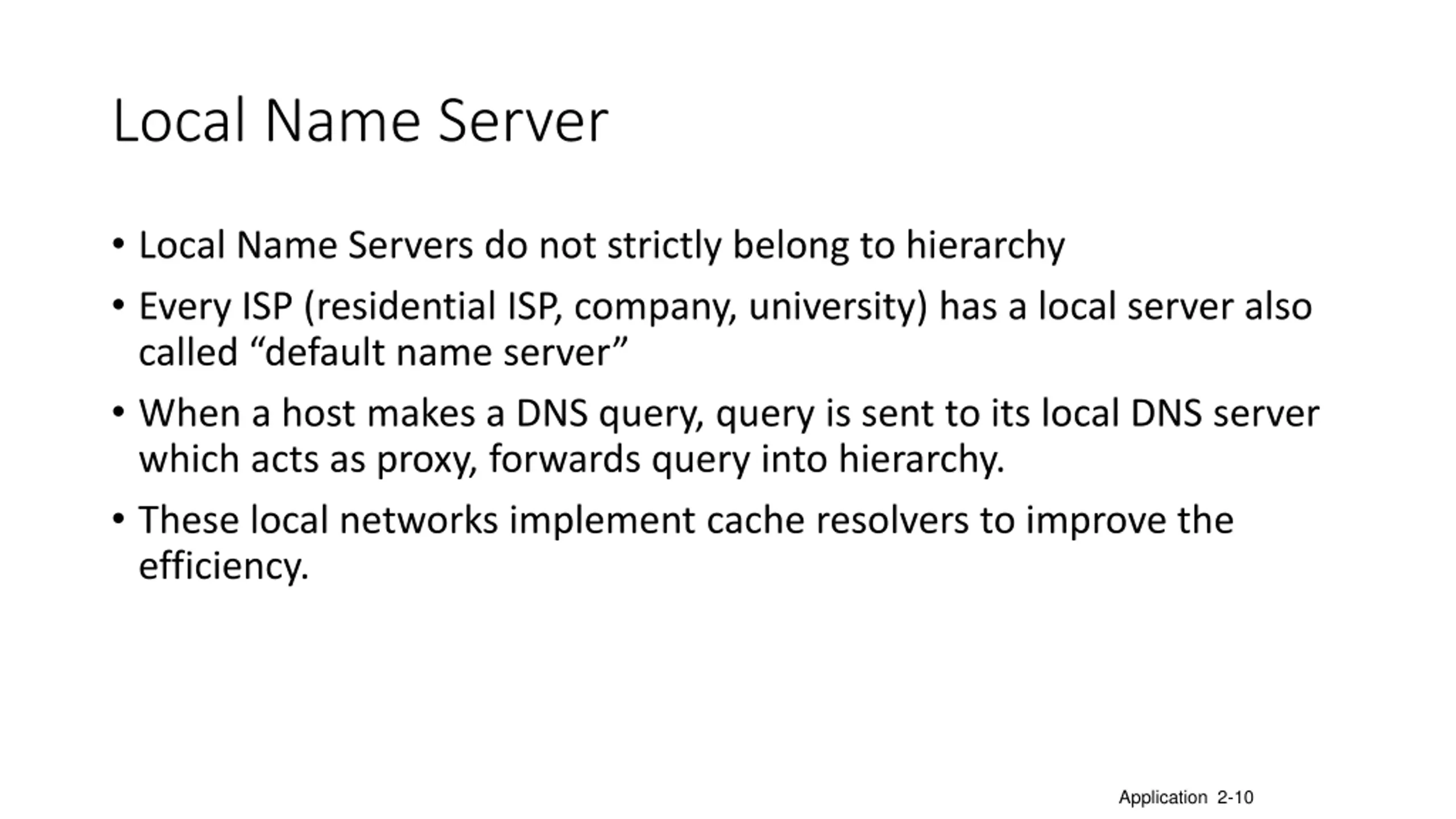 Local Name Server Local Name Servers do not strictly belong to hierarchy Every ISP (residential ISP, company, university) has a local server also called default name server When a host makes a DNS query, query is sent to its local DNS server which acts as proxy, forwards query into hierarchy. These local networks implement cache resolvers to improve the efficiency. Application 2-10