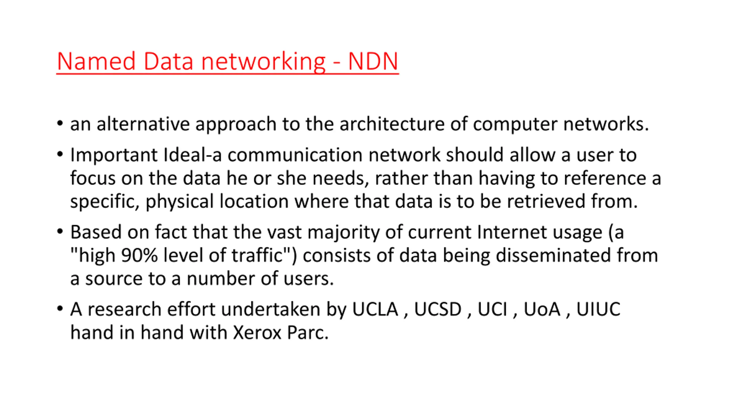 Named Data networking - NDN an alternative approach to the architecture of computer networks. Important Ideal-a communication network should allow a user to focus on the data he or she needs, rather than having to reference a specific, physical location where that data is to be retrieved from. Based on fact that the vast majority of current Internet usage (a "high 90% level of traffic") consists of data being disseminated from a source to a number of users. A research effort undertaken by UCLA , UCSD , UCI , UoA , UIUC hand in hand with Xerox Parc.