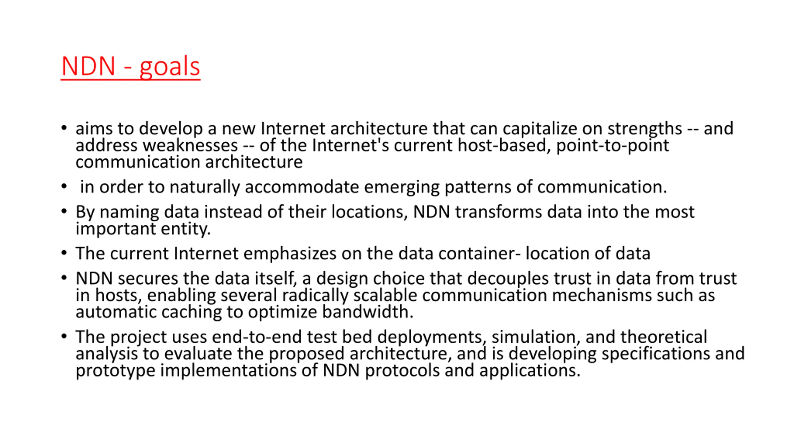 NDN - goals aims to develop a new Internet architecture that can capitalize on strengths -- and address weaknesses -- of the Internet's current host-based, point-to-point communication architecture in order to naturally accommodate emerging patterns of communication. By naming data instead of their locations, NDN transforms data into the most important entity. The current Internet emphasizes on the data container- location of data NDN secures the data itself, a design choice that decouples trust in data from trust in hosts, enabling several radically scalable communication mechanisms such as automatic caching to optimize bandwidth. The project uses end-to-end test bed deployments, simulation, and theoretical analysis to evaluate the proposed architecture, and is developing specifications and prototype implementations of NDN protocols and applications.