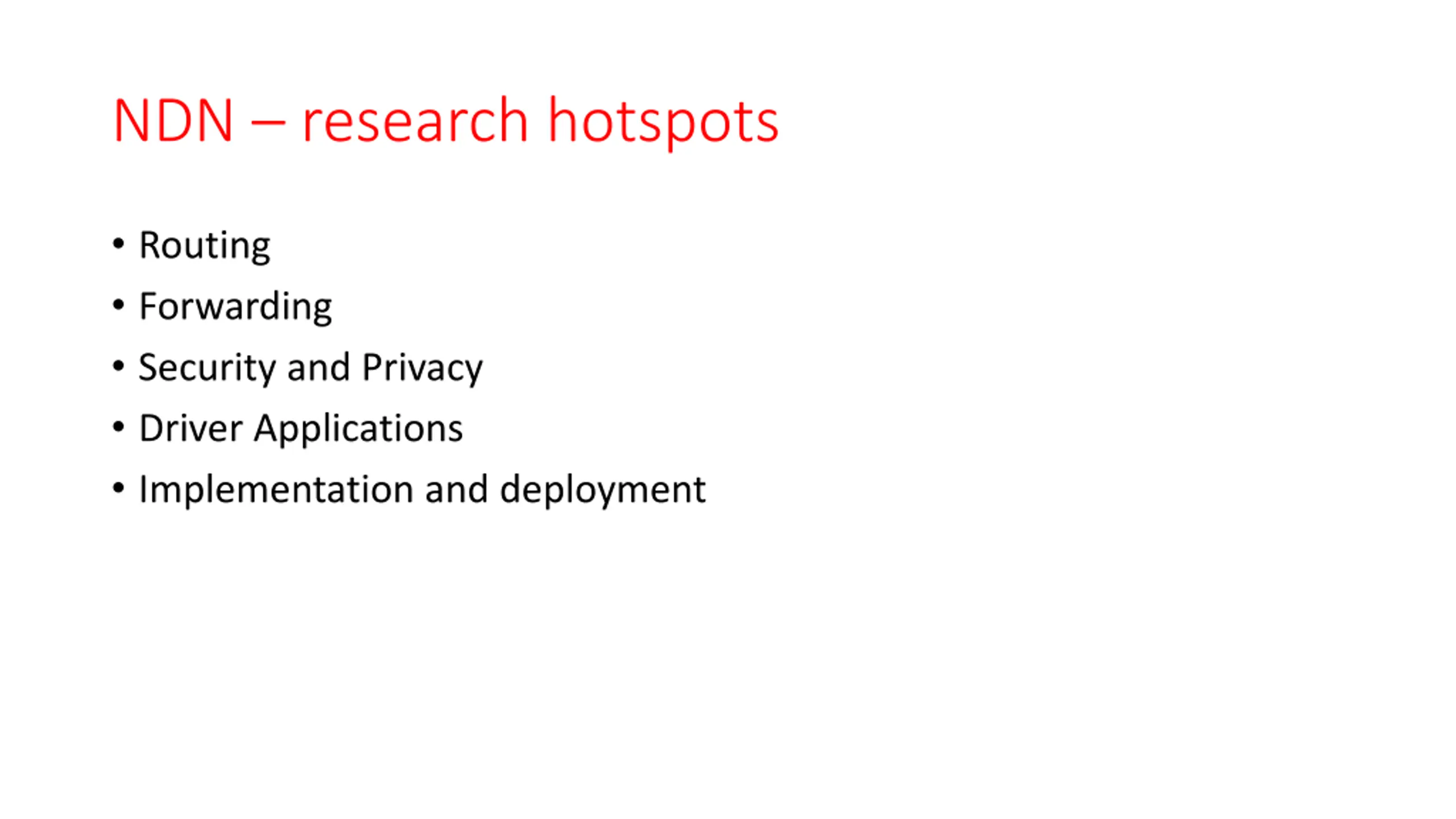 NDN research hotspots Routing Forwarding Security and Privacy Driver Applications Implementation and deployment