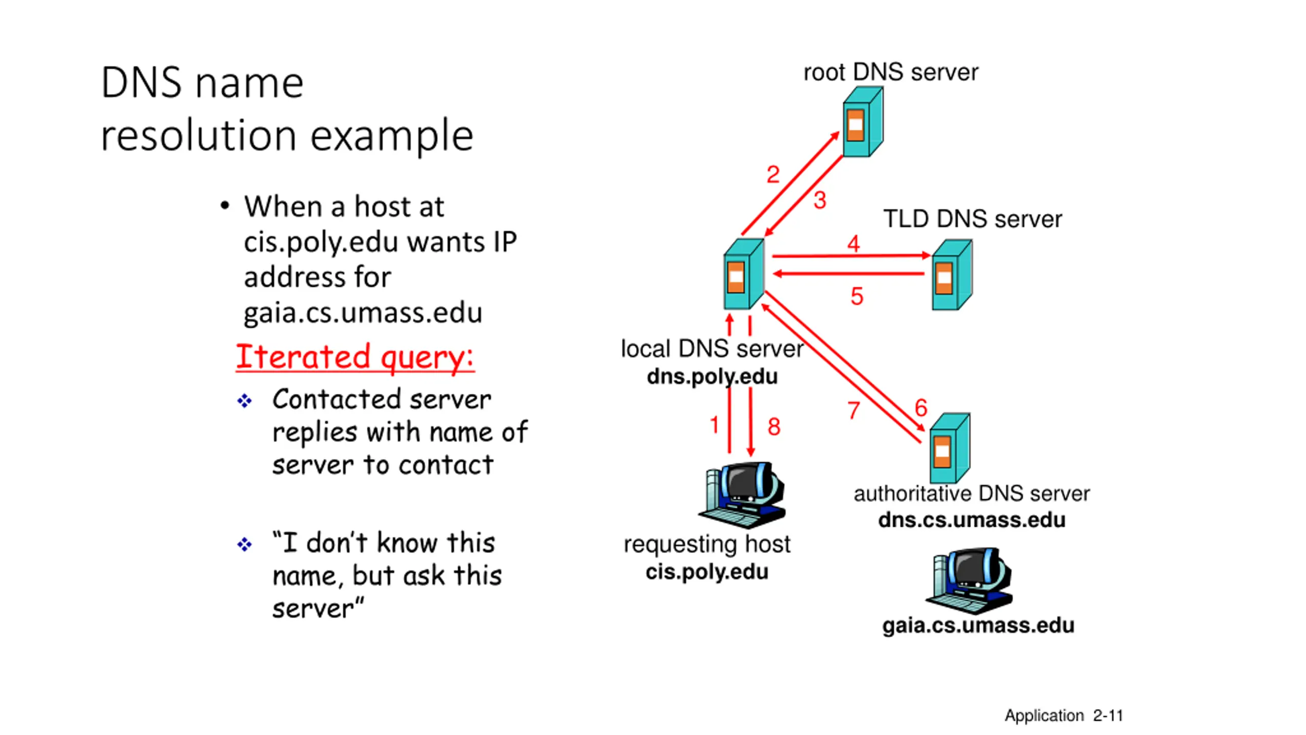 root DNS server DNS name resolution example 2 3 When a host at cis.poly.edu wants IP address for gaia.cs.umass.edu Iterated query: Contacted server replies with name of server to contact TLD DNS server 4 5 local DNS server dns.poly.edu 6 7 1 8 authoritative DNS server dns.cs.umass.edu I don t know this name, but ask this server requesting host cis.poly.edu gaia.cs.umass.edu Application 2-11