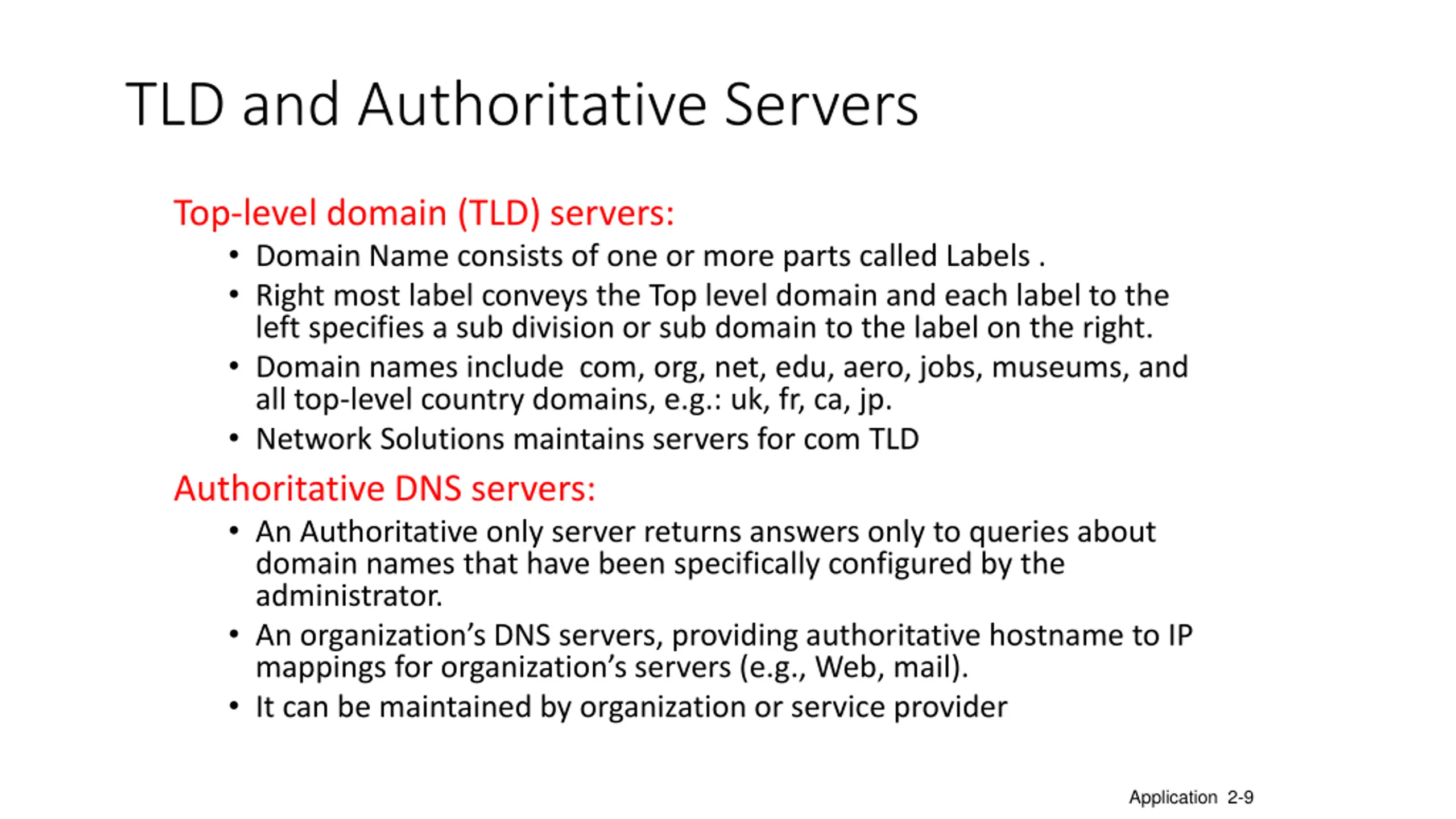 TLD and Authoritative Servers Top-level domain (TLD) servers: Domain Name consists of one or more parts called Labels . Right most label conveys the Top level domain and each label to the left specifies a sub division or sub domain to the label on the right. Domain names include com, org, net, edu, aero, jobs, museums, and all top-level country domains, e.g.: uk, fr, ca, jp. Network Solutions maintains servers for com TLD Authoritative DNS servers: An Authoritative only server returns answers only to queries about domain names that have been specifically configured by the administrator. An organization s DNS servers, providing authoritative hostname to IP mappings for organization s servers (e.g., Web, mail). It can be maintained by organization or service provider Application 2-9