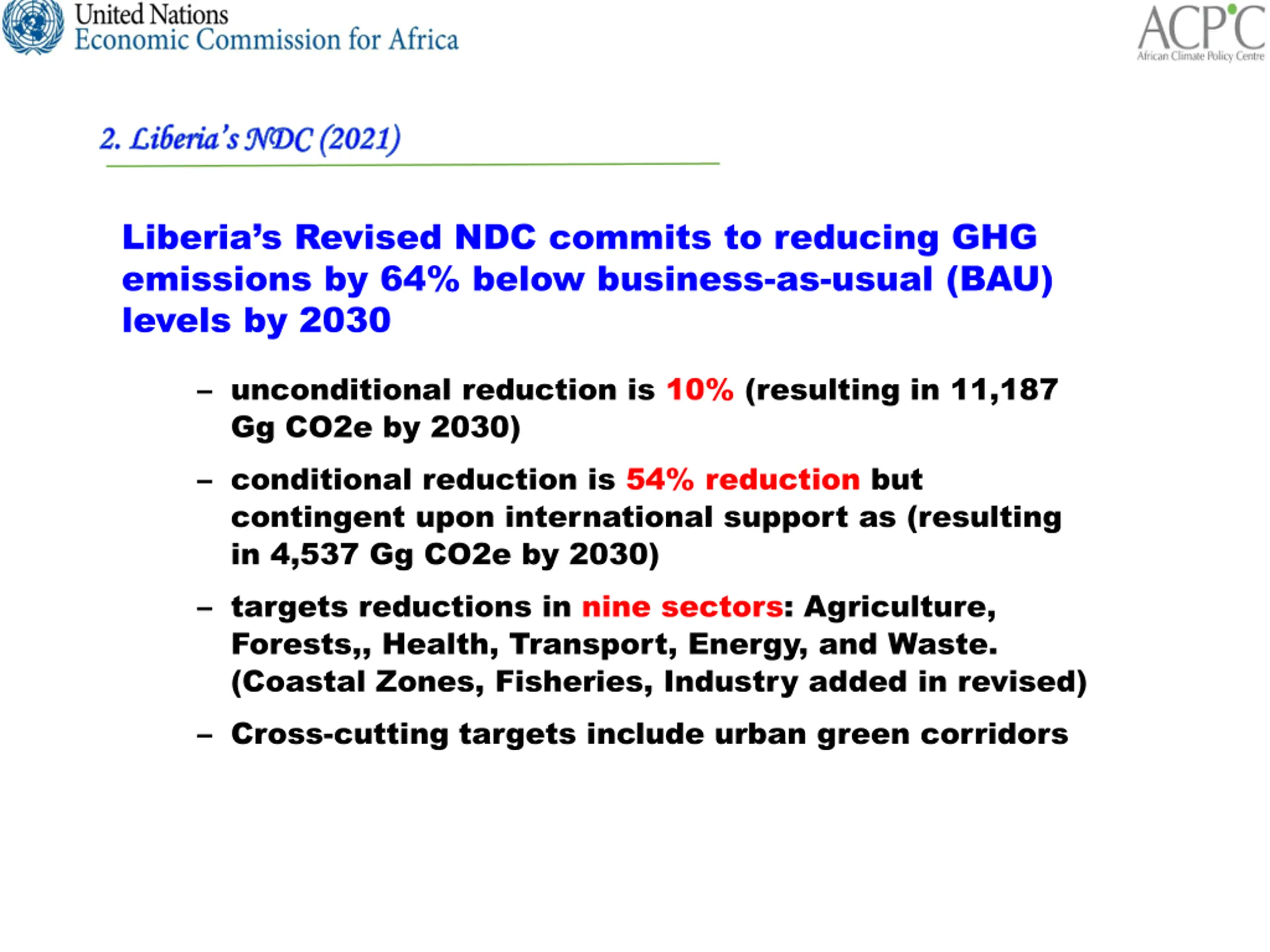 2. Liberias NDC (2021) 2. Liberia s NDC (2021) Liberia s Revised NDC commits to reducing GHG emissions by 64% below business-as-usual (BAU) levels by 2030 unconditional reduction is 10% (resulting in 11,187 Gg CO2e by 2030) conditional reduction is 54% reduction but contingent upon international support as (resulting in 4,537 Gg CO2e by 2030) targets reductions in nine sectors: Agriculture, Forests,, Health, Transport, Energy, and Waste. (Coastal Zones, Fisheries, Industry added in revised) Cross-cutting targets include urban green corridors