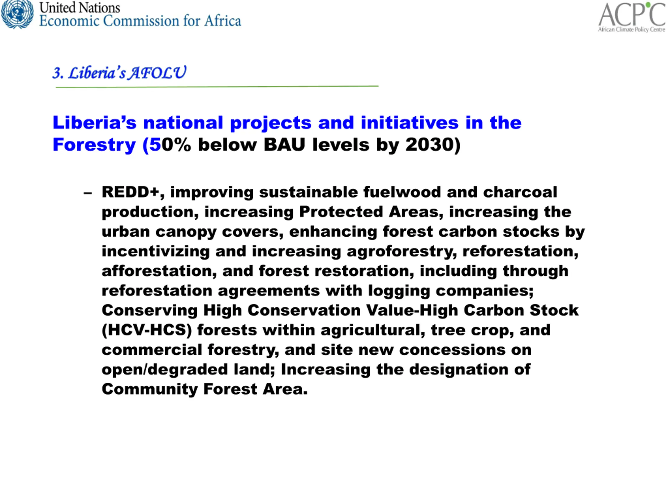 3. Liberias AFOLU 3. Liberia s AFOLU Liberia s national projects and initiatives in the Forestry (50% below BAU levels by 2030) REDD+, improving sustainable fuelwood and charcoal production, increasing Protected Areas, increasing the urban canopy covers, enhancing forest carbon stocks by incentivizing and increasing agroforestry, reforestation, afforestation, and forest restoration, including through reforestation agreements with logging companies; Conserving High Conservation Value-High Carbon Stock (HCV-HCS) forests within agricultural, tree crop, and commercial forestry, and site new concessions on open/degraded land; Increasing the designation of Community Forest Area.