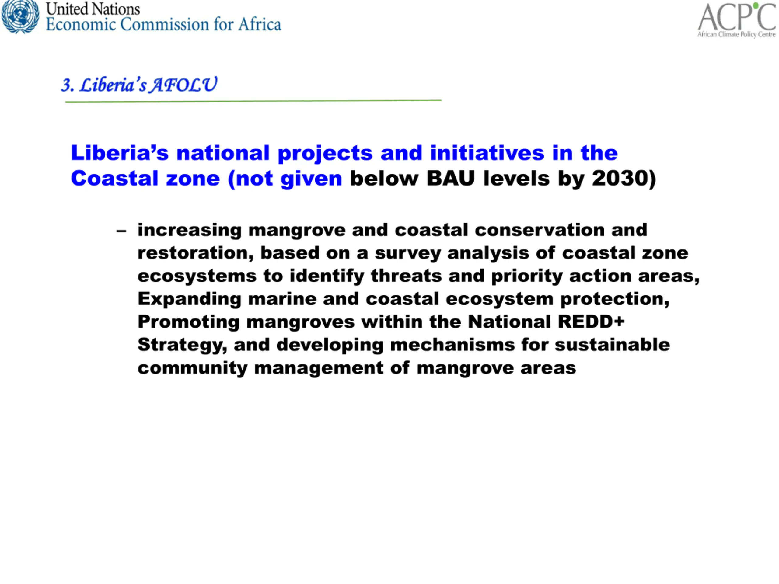 3. Liberias AFOLU 3. Liberia s AFOLU Liberia s national projects and initiatives in the Coastal zone (not given below BAU levels by 2030) increasing mangrove and coastal conservation and restoration, based on a survey analysis of coastal zone ecosystems to identify threats and priority action areas, Expanding marine and coastal ecosystem protection, Promoting mangroves within the National REDD+ Strategy, and developing mechanisms for sustainable community management of mangrove areas