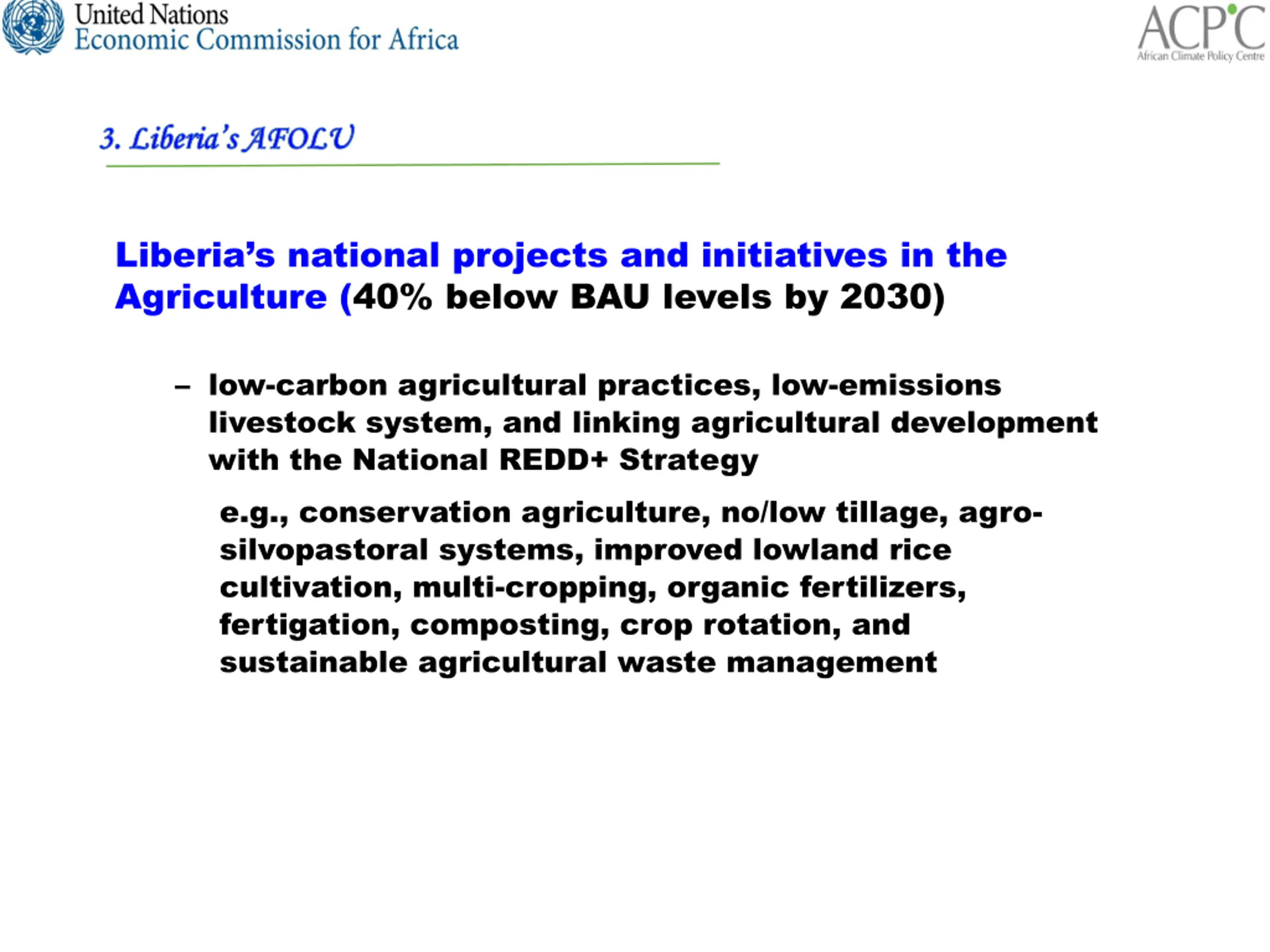 3. Liberias AFOLU 3. Liberia s AFOLU Liberia s national projects and initiatives in the Agriculture (40% below BAU levels by 2030) low-carbon agricultural practices, low-emissions livestock system, and linking agricultural development with the National REDD+ Strategy e.g., conservation agriculture, no/low tillage, agro- silvopastoral systems, improved lowland rice cultivation, multi-cropping, organic fertilizers, fertigation, composting, crop rotation, and sustainable agricultural waste management