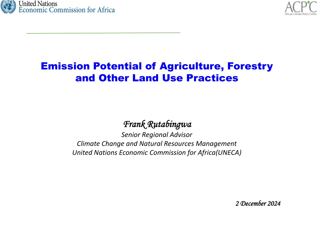 Emission Potential of Agriculture, Forestry and Other Land Use Practices Frank Rutabingwa Frank Rutabingwa Senior Regional Advisor Climate Change and Natural Resources Management United Nations Economic Commission for Africa(UNECA) 2 December 2024 2 December 2024