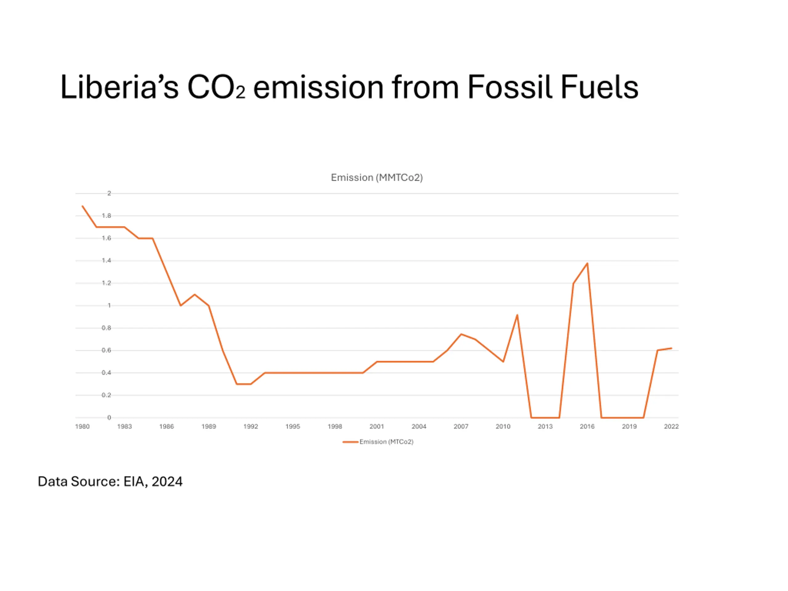 Liberias CO2 emission from Fossil Fuels Emission (MMTCo2) 2 1.8 1.6 1.4 1.2 1 0.8 0.6 0.4 0.2 0 1980 1983 1986 1989 1992 1995 1998 2001 2004 2007 2010 2013 2016 2019 2022 Emission (MTCo2) Data Source: EIA, 2024