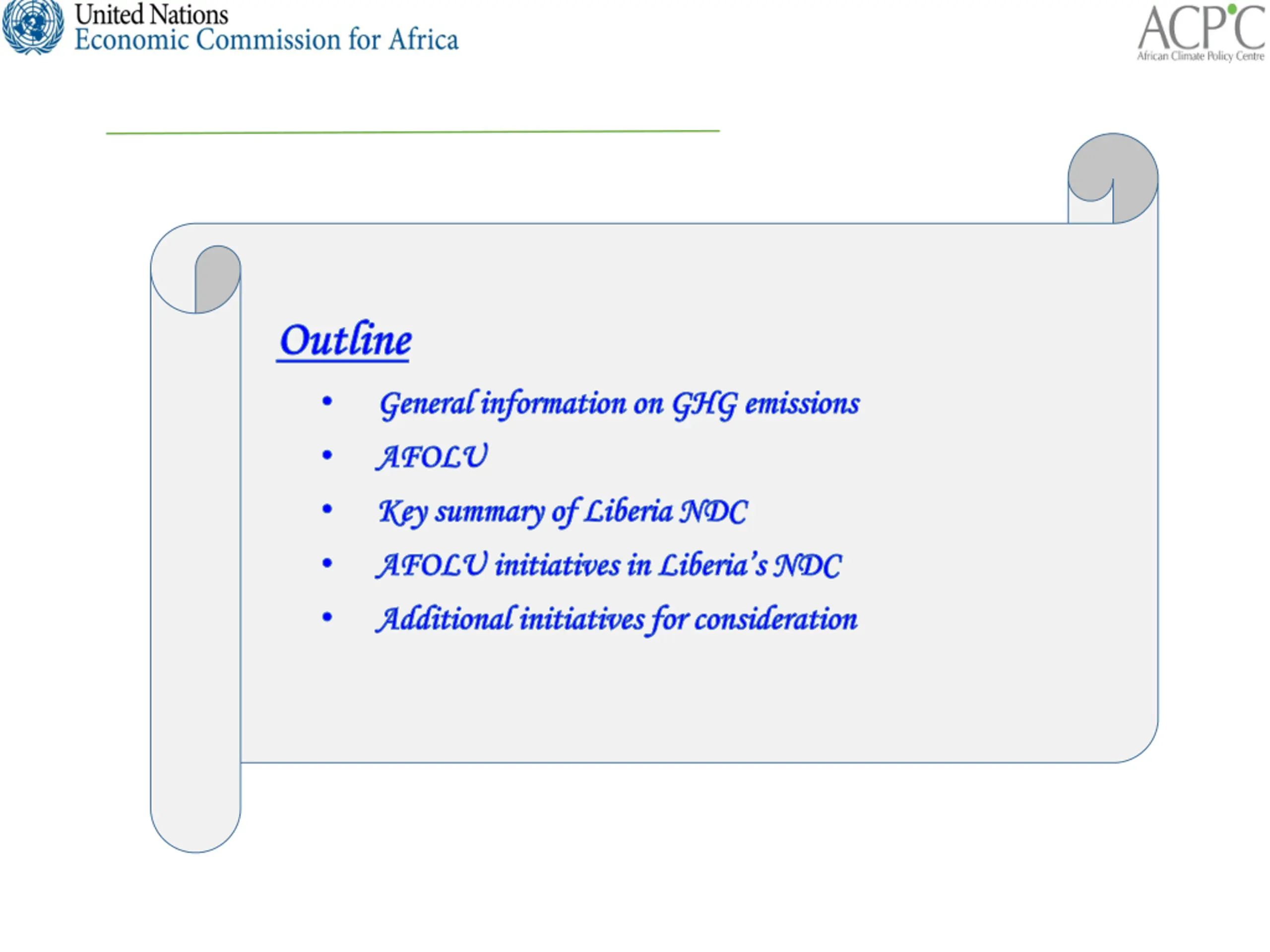 Outline Outline General information on GHG emissions General information on GHG emissions AFOLU AFOLU Key summary of Liberia NDC Key summary of Liberia NDC AFOLU initiatives in Liberia s NDC AFOLU initiatives in Liberia s NDC Additional initiatives for consideration Additional initiatives for consideration