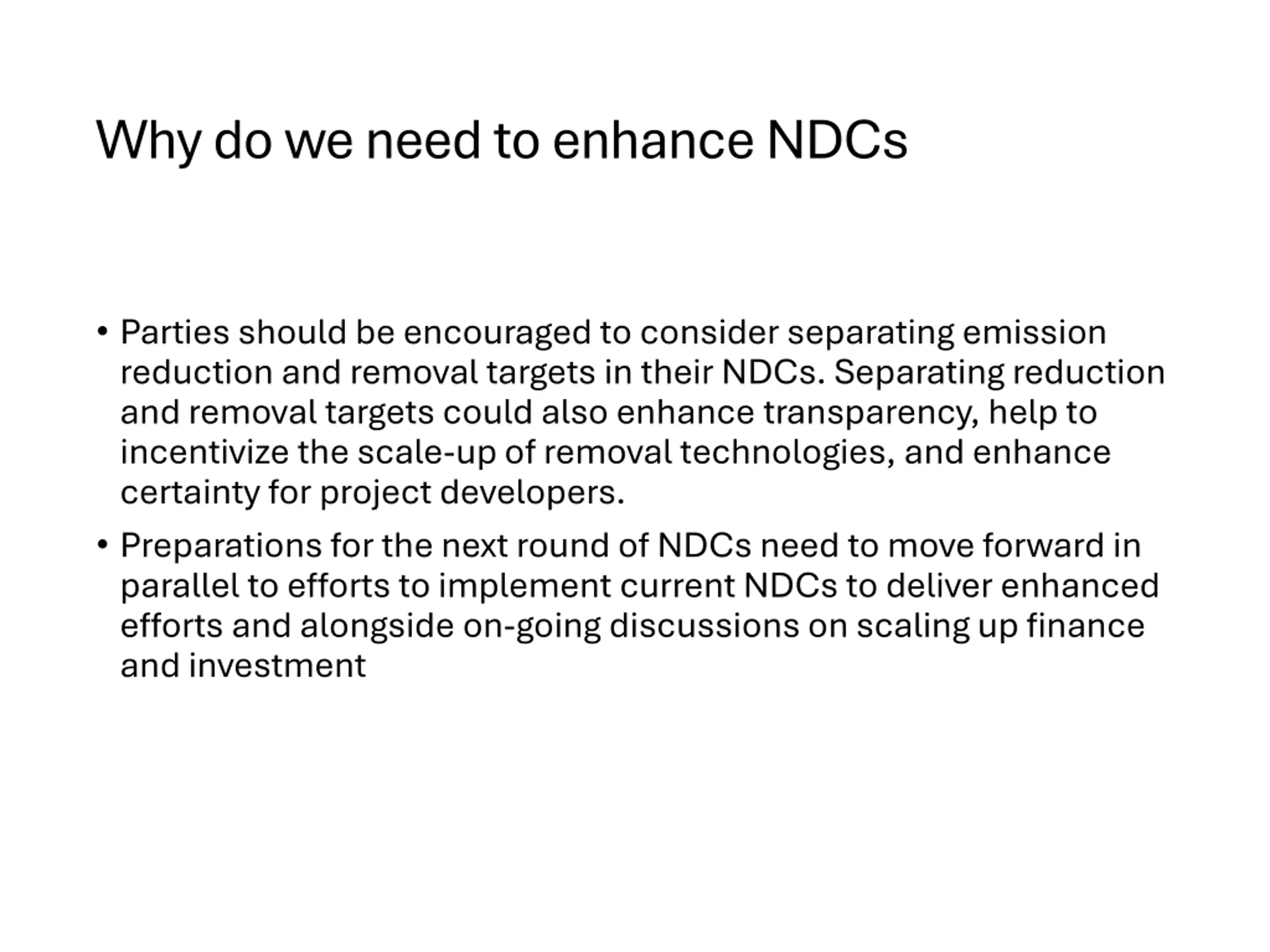 Why do we need to enhance NDCs Parties should be encouraged to consider separating emission reduction and removal targets in their NDCs. Separating reduction and removal targets could also enhance transparency, help to incentivize the scale-up of removal technologies, and enhance certainty for project developers. Preparations for the next round of NDCs need to move forward in parallel to efforts to implement current NDCs to deliver enhanced efforts and alongside on-going discussions on scaling up finance and investment