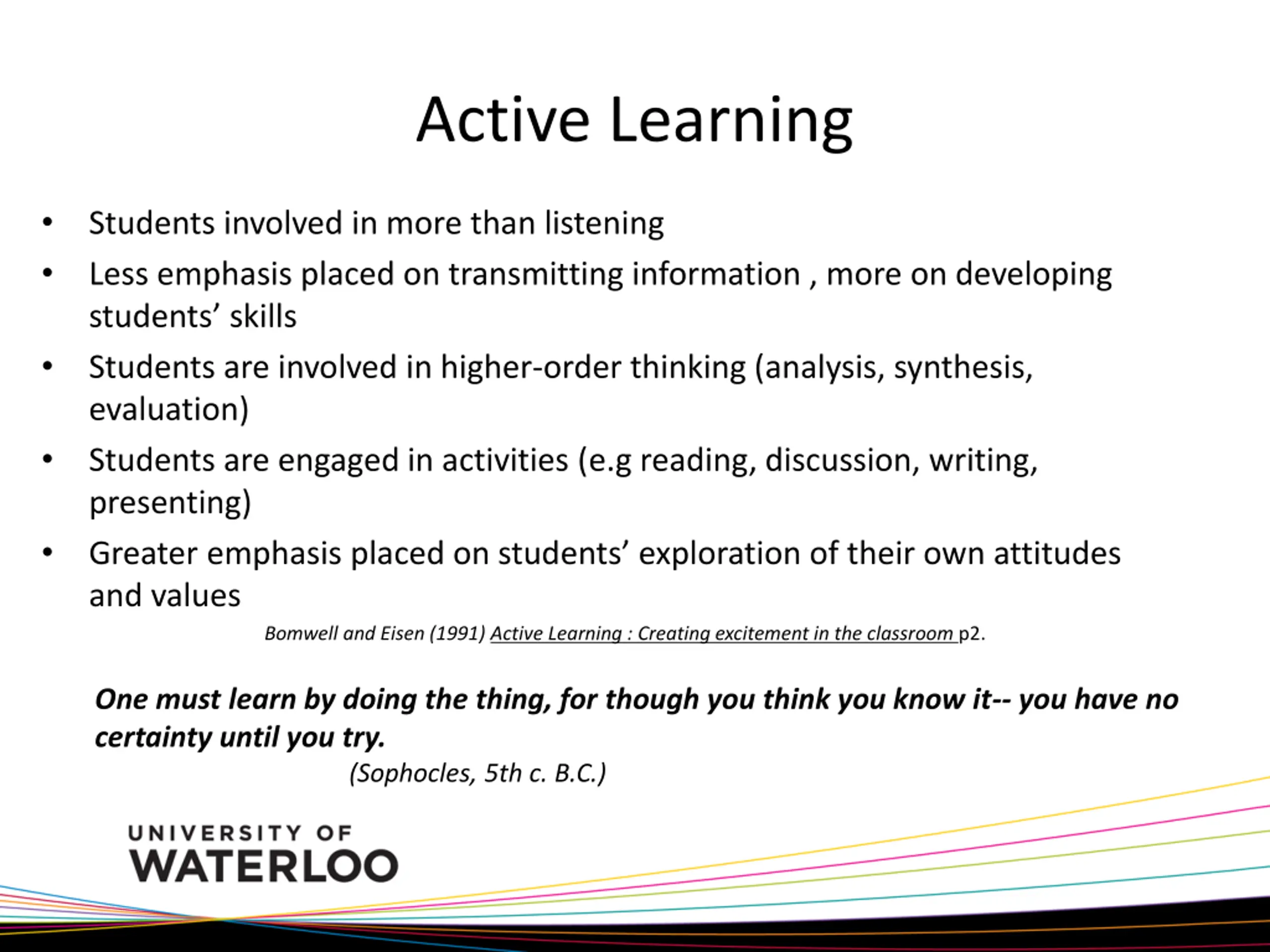 Active Learning Students involved in more than listening Less emphasis placed on transmitting information , more on developing students skills Students are involved in higher-order thinking (analysis, synthesis, evaluation) Students are engaged in activities (e.g reading, discussion, writing, presenting) Greater emphasis placed on students exploration of their own attitudes and values Bomwell and Eisen (1991) Active Learning : Creating excitement in the classroom p2. One must learn by doing the thing, for though you think you know it-- you have no certainty until you try. (Sophocles, 5th c. B.C.)