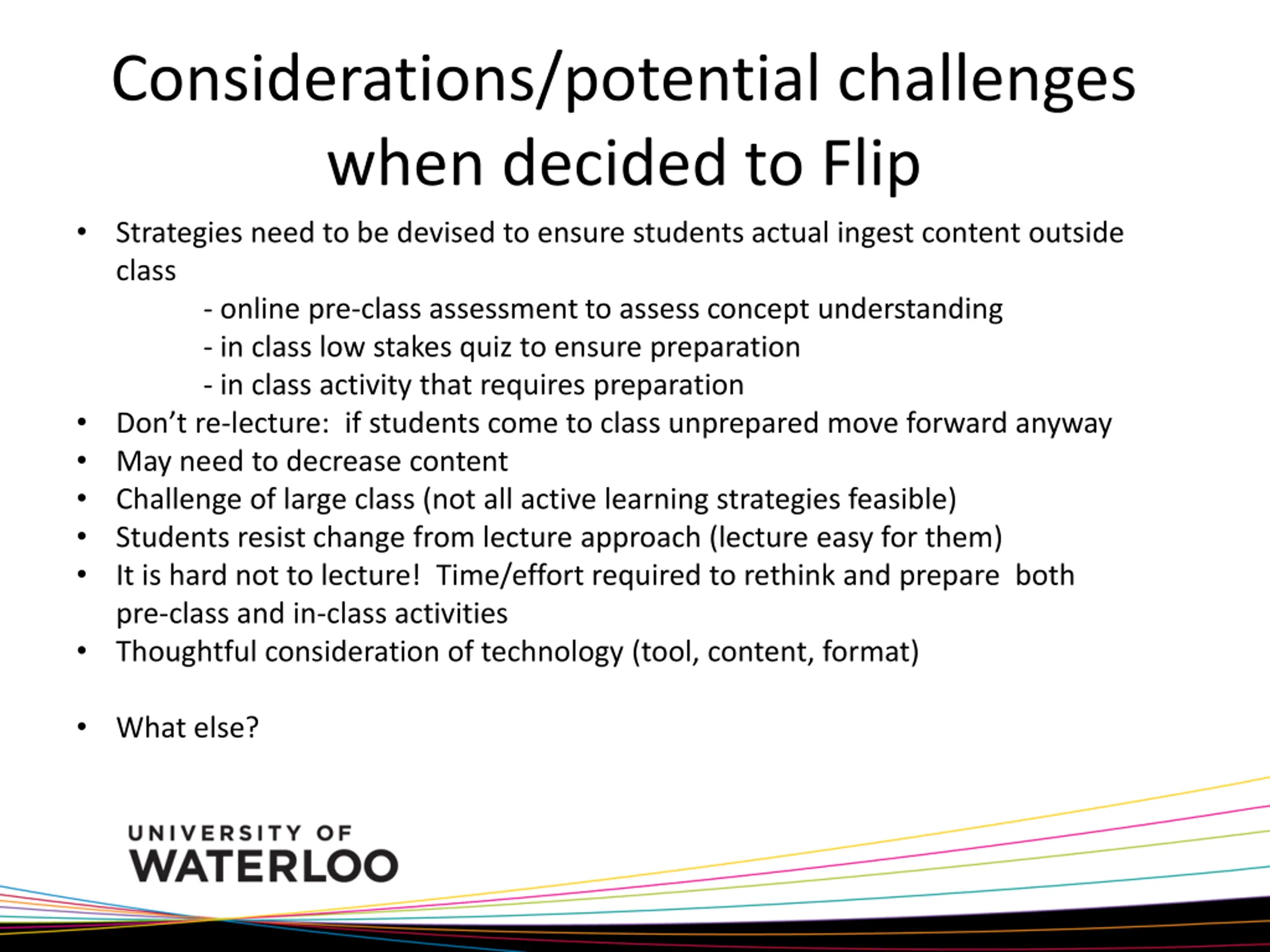 Considerations/potential challenges when decided to Flip Strategies need to be devised to ensure students actual ingest content outside class - online pre-class assessment to assess concept understanding - in class low stakes quiz to ensure preparation - in class activity that requires preparation Don t re-lecture: if students come to class unprepared move forward anyway May need to decrease content Challenge of large class (not all active learning strategies feasible) Students resist change from lecture approach (lecture easy for them) It is hard not to lecture! Time/effort required to rethink and prepare both pre-class and in-class activities Thoughtful consideration of technology (tool, content, format) What else?