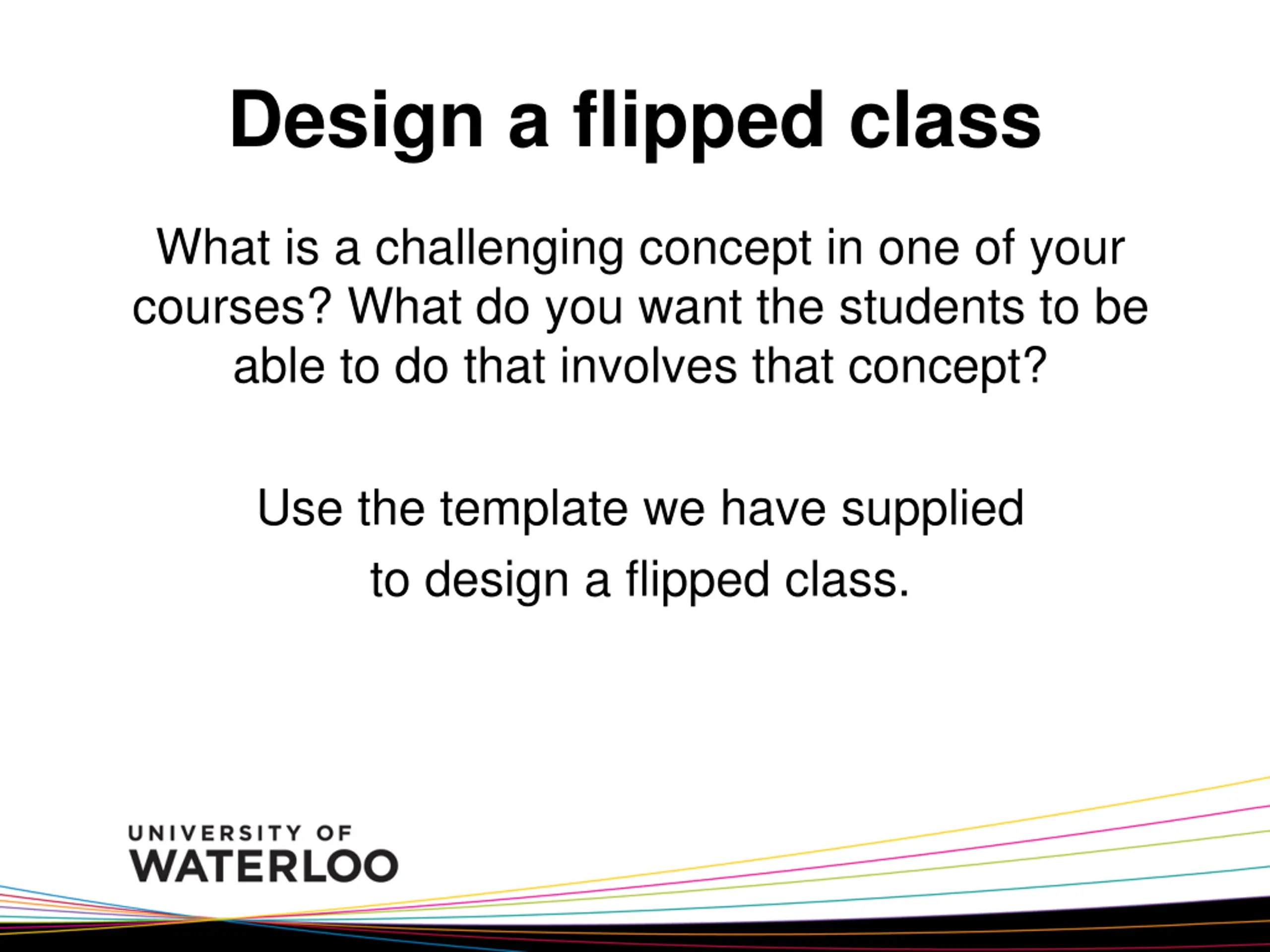 Design a flipped class What is a challenging concept in one of your courses? What do you want the students to be able to do that involves that concept? Use the template we have supplied to design a flipped class.