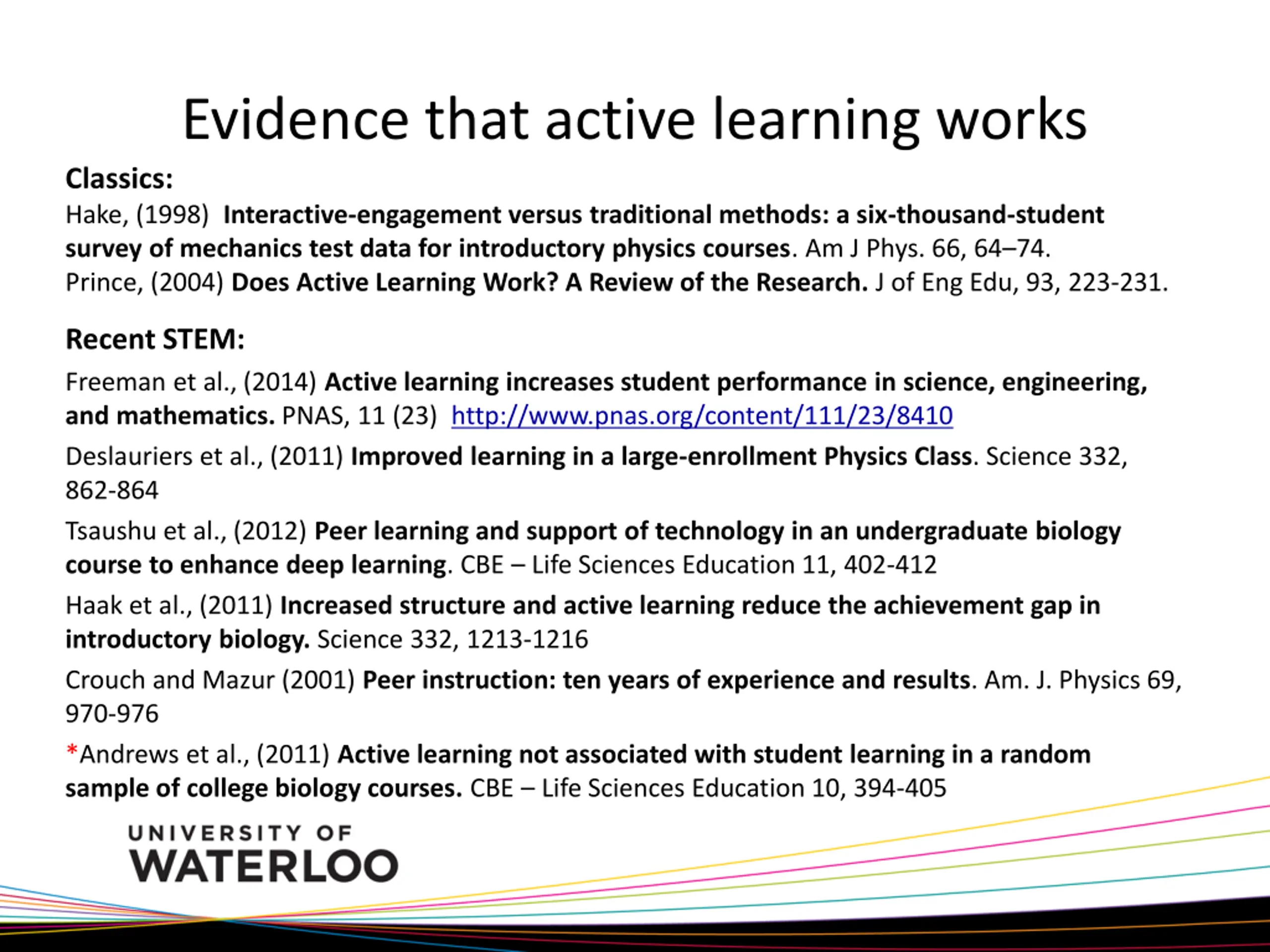 Evidence that active learning works Classics: Hake, (1998) Interactive-engagement versus traditional methods: a six-thousand-student survey of mechanics test data for introductory physics courses. Am J Phys. 66, 64 74. Prince, (2004) Does Active Learning Work? A Review of the Research. J of Eng Edu, 93, 223-231. Recent STEM: Freeman et al., (2014) Active learning increases student performance in science, engineering, and mathematics. PNAS, 11 (23) http://www.pnas.org/content/111/23/8410 Deslauriers et al., (2011) Improved learning in a large-enrollment Physics Class. Science 332, 862-864 Tsaushu et al., (2012) Peer learning and support of technology in an undergraduate biology course to enhance deep learning. CBE Life Sciences Education 11, 402-412 Haak et al., (2011) Increased structure and active learning reduce the achievement gap in introductory biology. Science 332, 1213-1216 Crouch and Mazur (2001) Peer instruction: ten years of experience and results. Am. J. Physics 69, 970-976 *Andrews et al., (2011) Active learning not associated with student learning in a random sample of college biology courses. CBE Life Sciences Education 10, 394-405